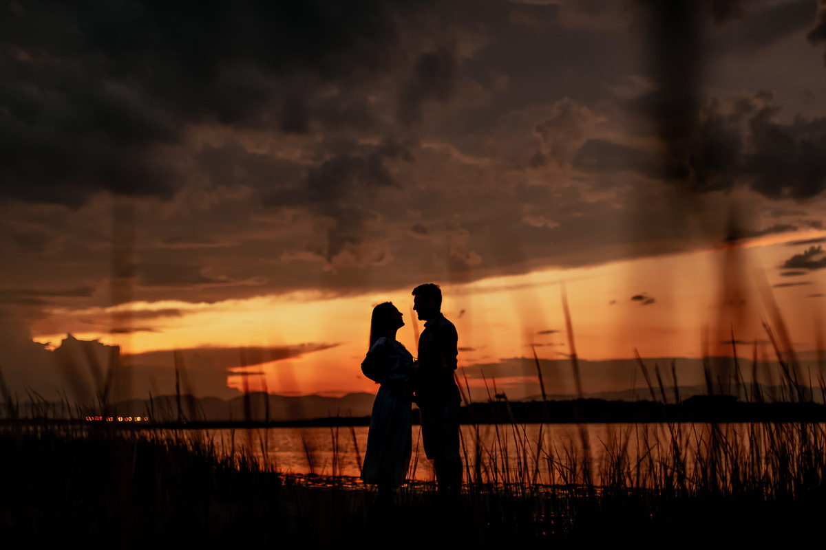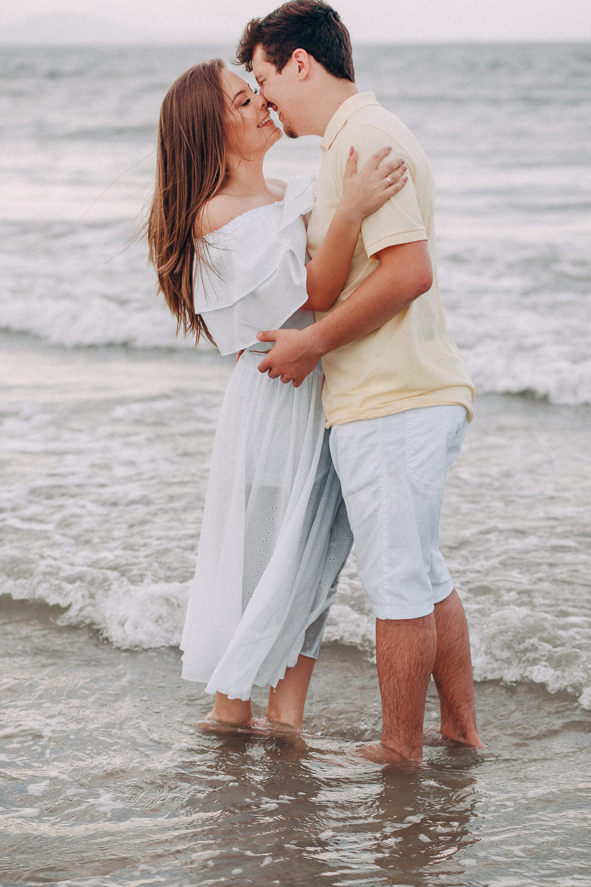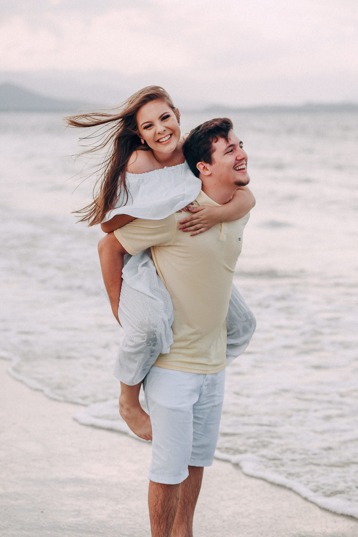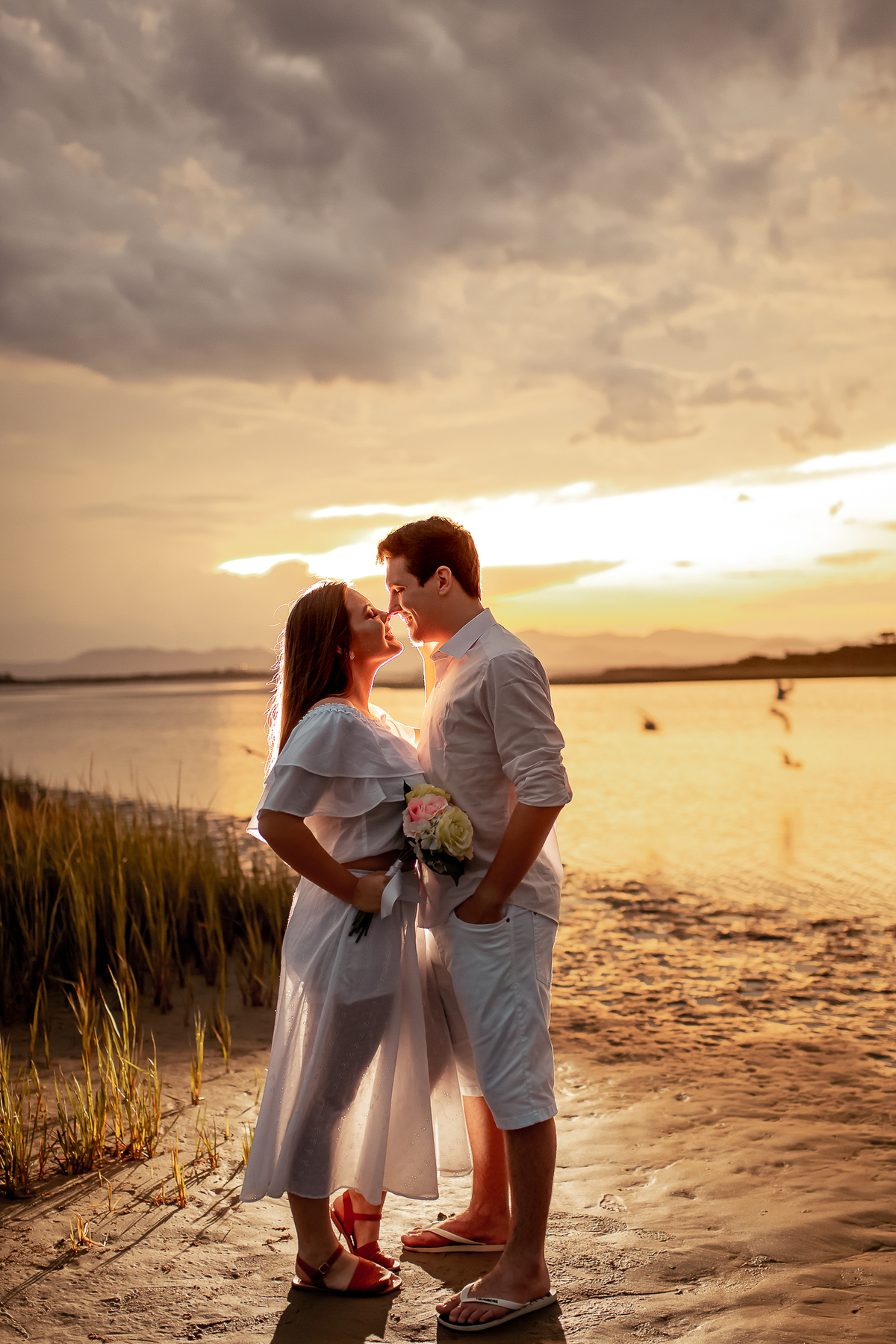 Então escolhemos janeiro, pois o casamento acontece em março, e, como eles amam praia e sonhavam com um ensaio com os pés na areia, a cidade escolhida foi São Francisco do Sul. Foi um dia incrível! O calor de janeiro foi amenizado pela brisa do mar, começamos a fotografar na sombra das árvores e quando o tempo nublo, horas antes do por sol, corremos para o mar e nos divertimos a beça. Achamos que não iria ter foto de por do sol, com aquele céu lindo, mas o dia foi tão bom que nem estávamos tristes... muito pelo contrário! Mas, nos últimos instantes, quando estávamos quase nos despedimos, eis que surge um céu de cores que hipnotizavam quem tivesse olhando e conseguimos fazer as últimas fotos dignas de um sonho.