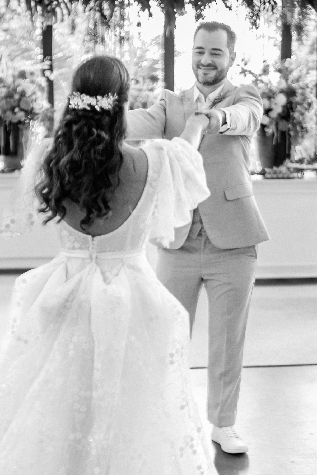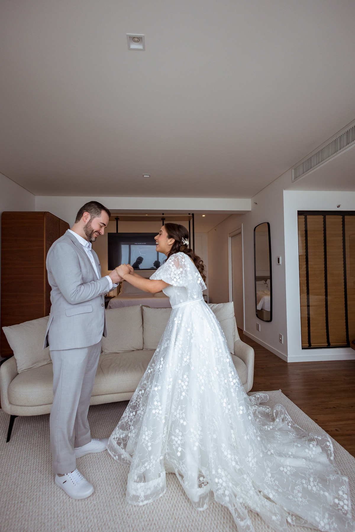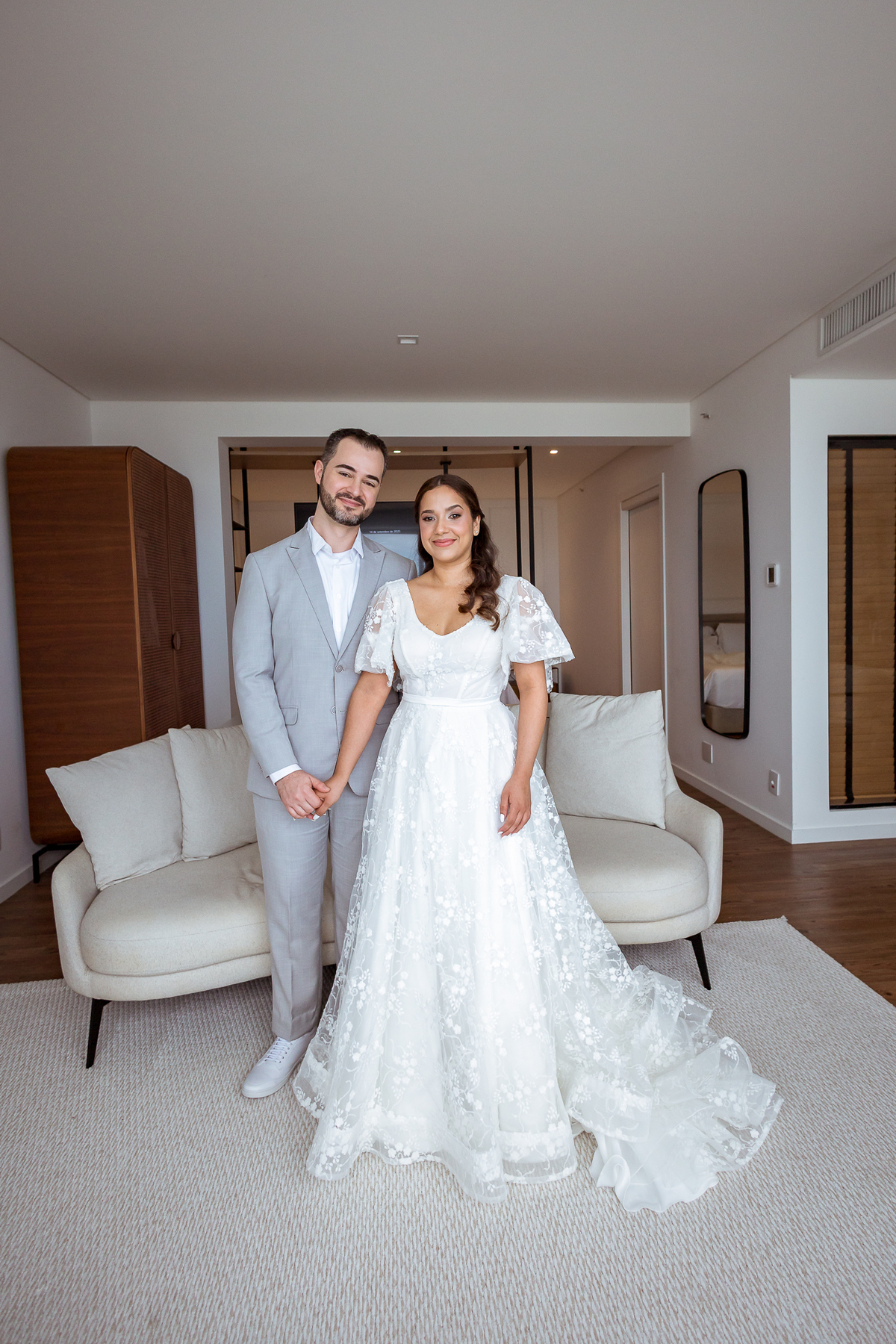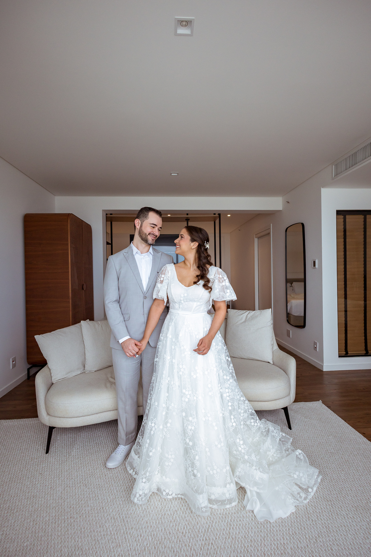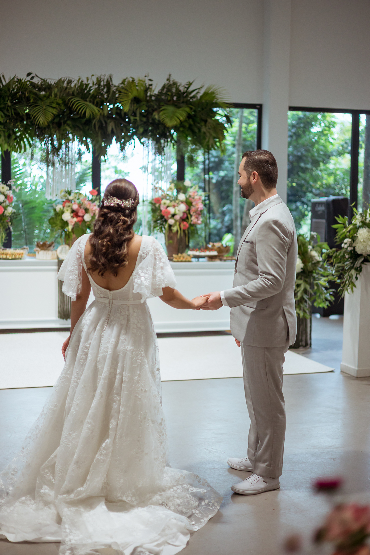 Antes do “sim”, os dois se arrumaram no mesmo hotel, mas em quartos separados. Viveram um emocionante first look, quando se viram já prontos, e seguiram juntos para a cerimônia. Também compartilharam o momento de ver a decoração do salão antes de todos — um gesto que traduziu bem a parceria construída ao longo de quase duas décadas.