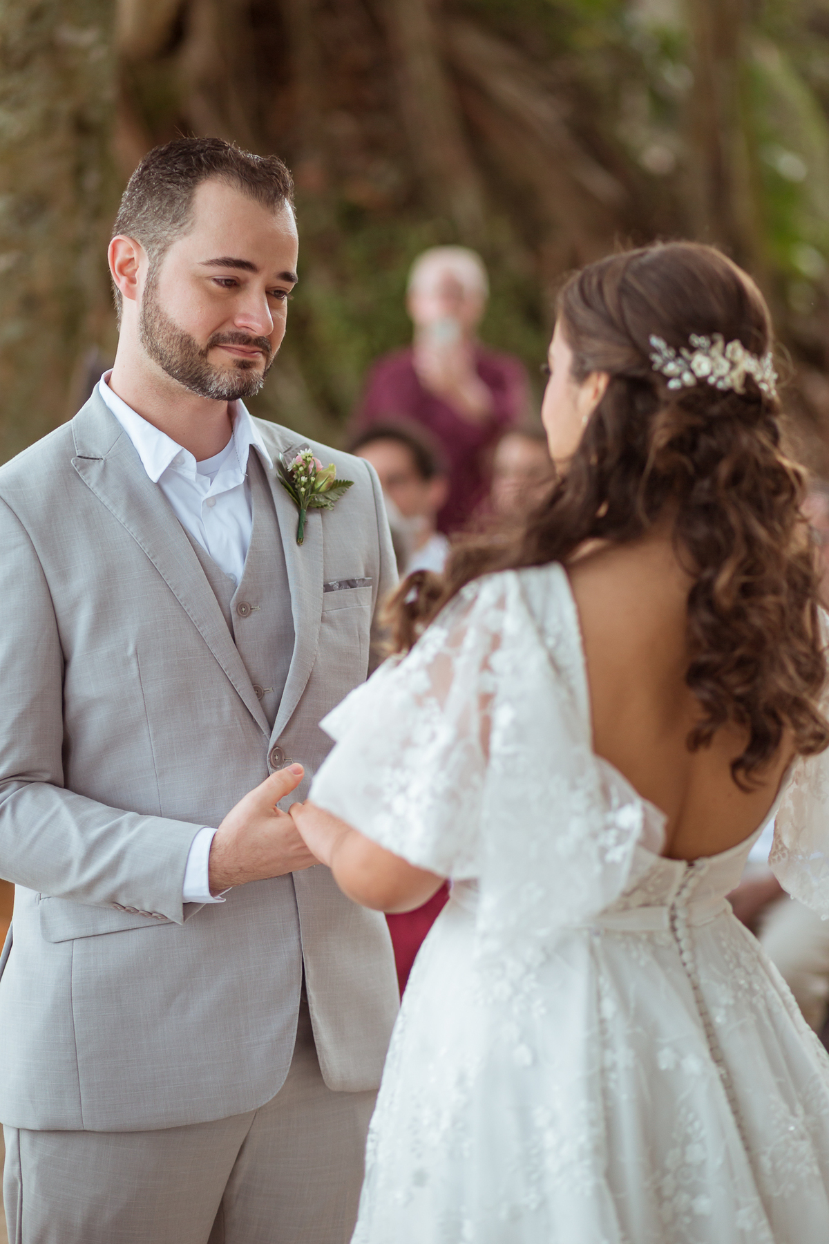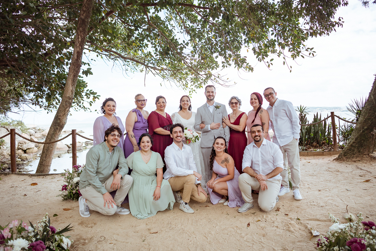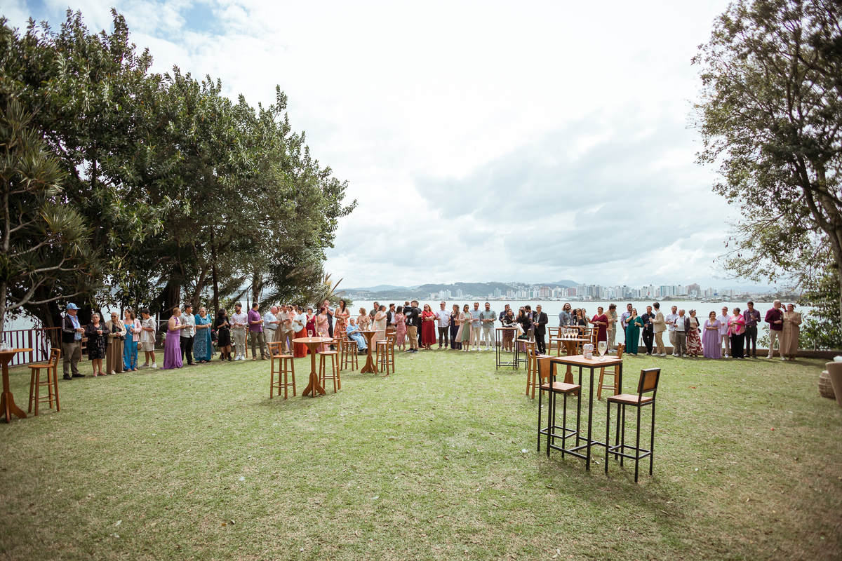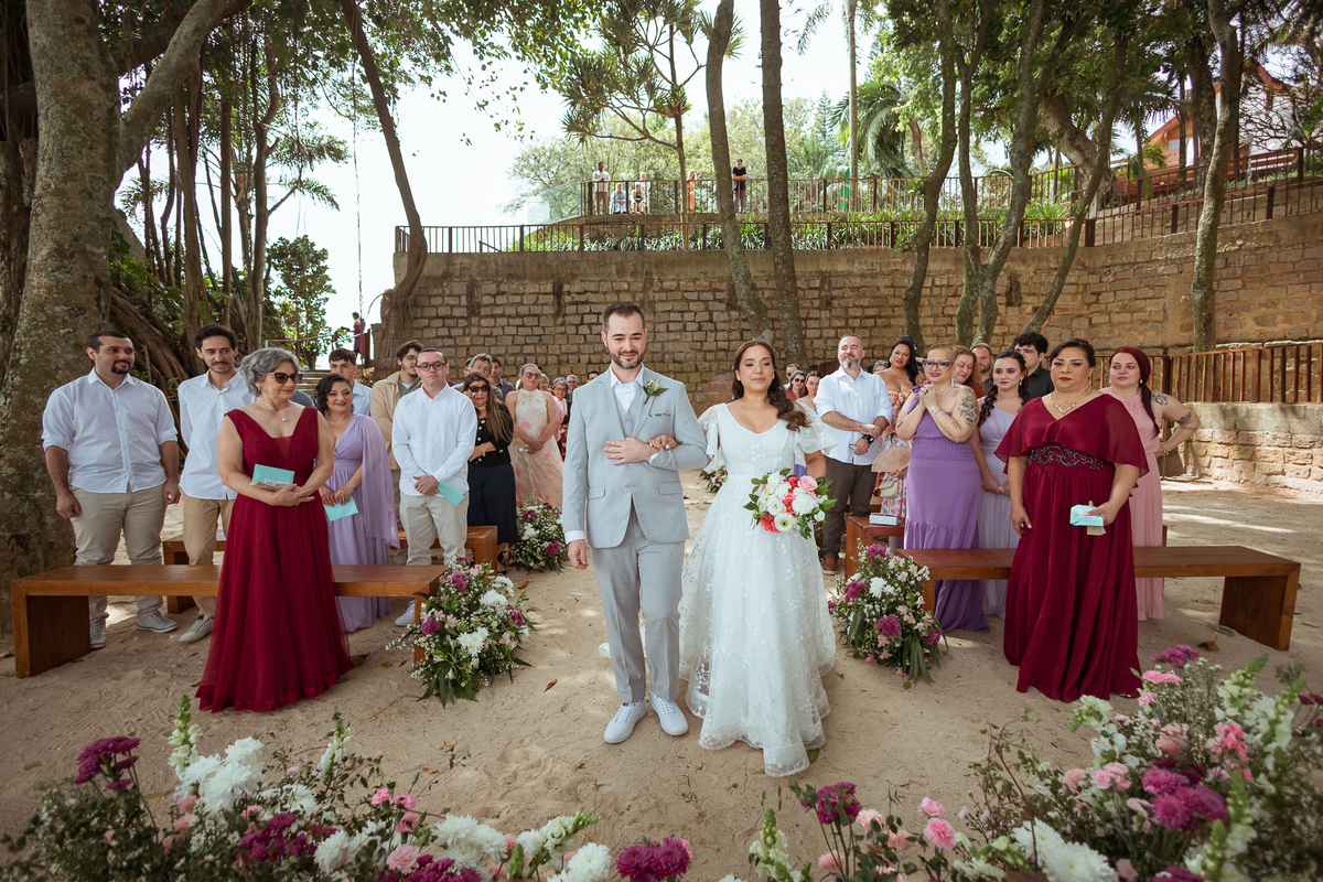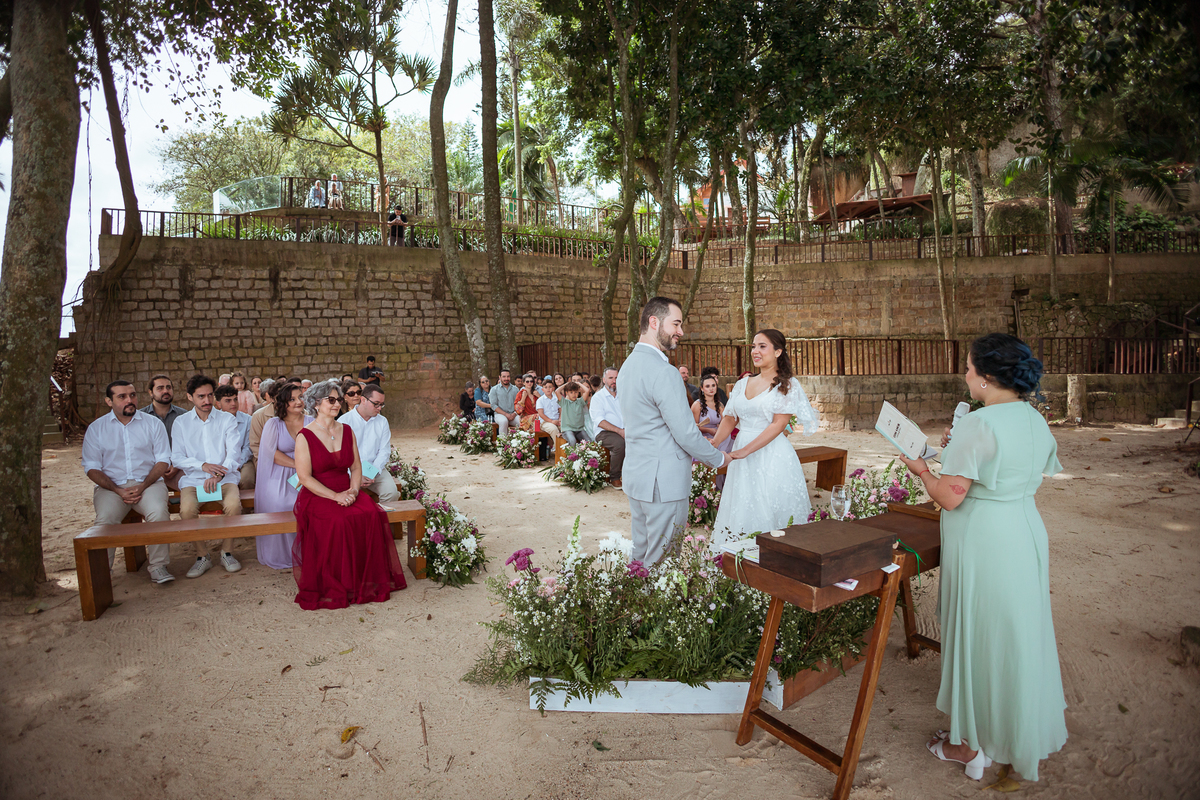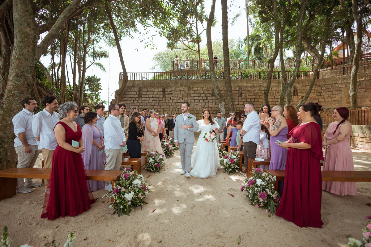 A cerimônia aconteceu em uma manhã de domingo, embaixo de uma árvore no Lusch Garden, com o mar como testemunha. O casal sempre sonhou com um almoço de domingo reunindo família e amigos — e foi exatamente assim: íntimo, afetivo e cheio de leveza.