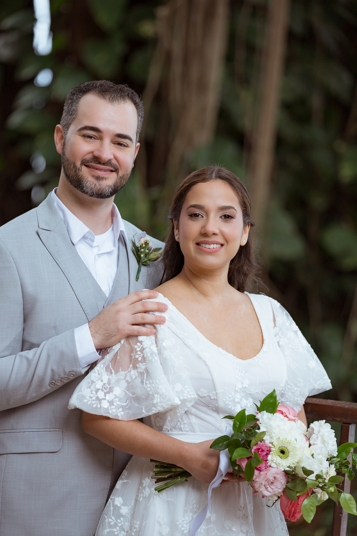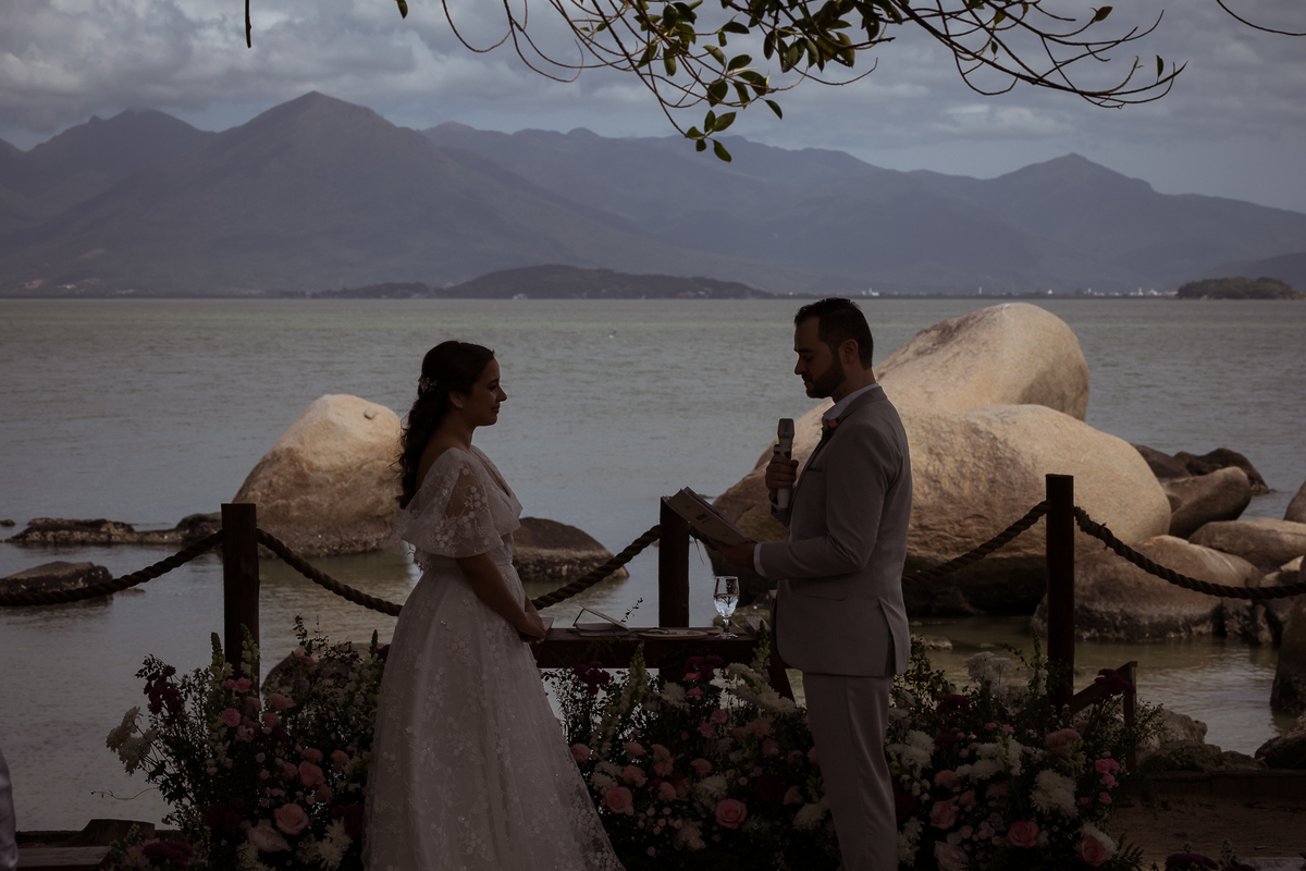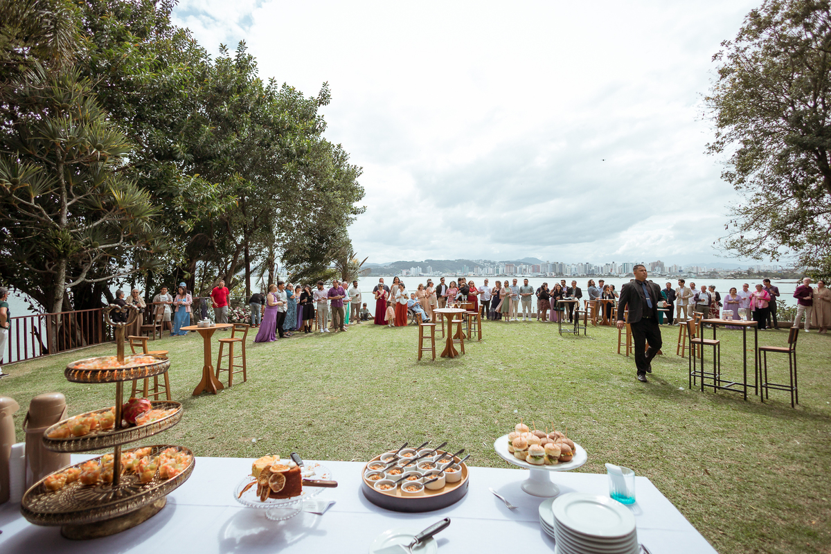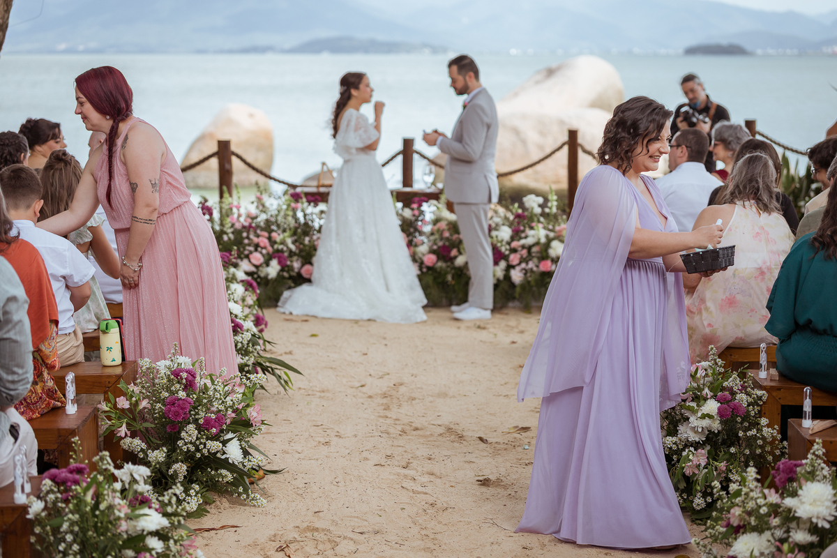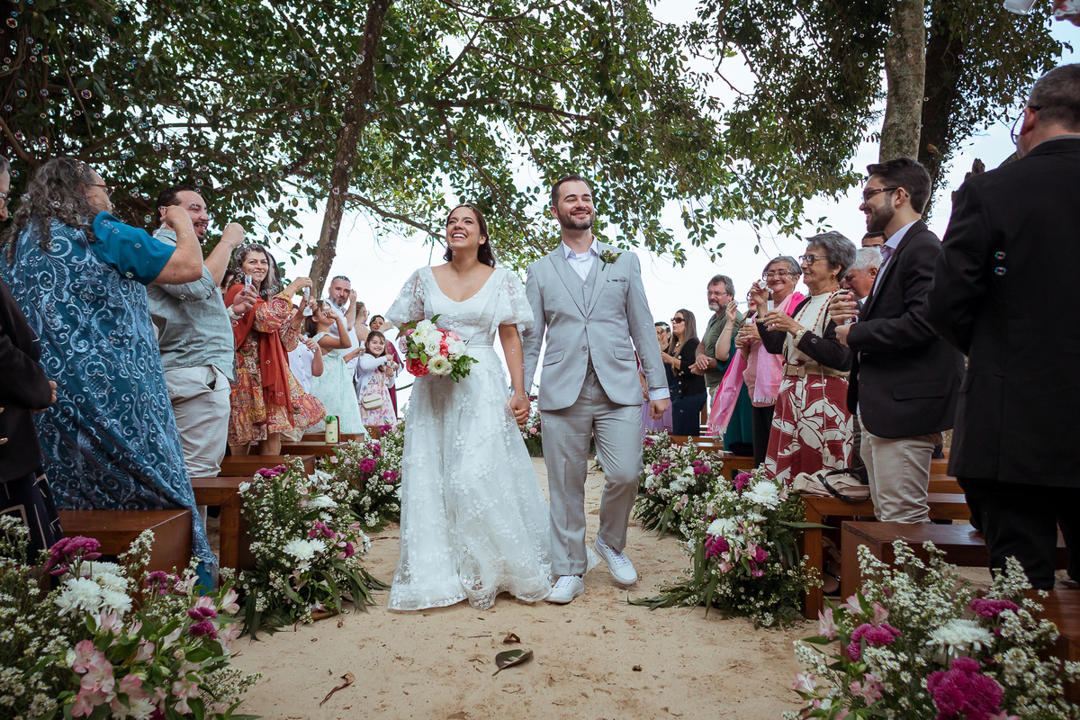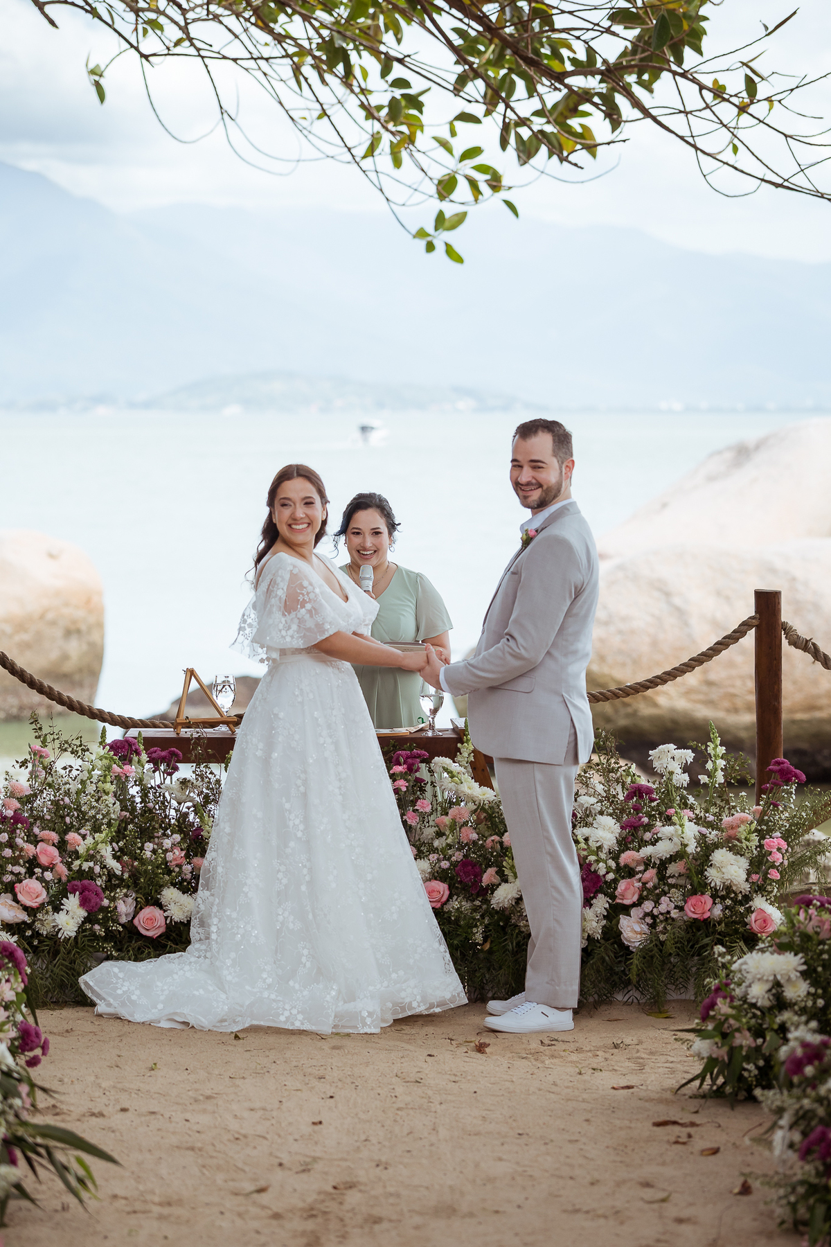 A cerimônia aconteceu em uma manhã de domingo, embaixo de uma árvore no Lusch Garden, com o mar como testemunha. O casal sempre sonhou com um almoço de domingo reunindo família e amigos — e foi exatamente assim: íntimo, afetivo e cheio de leveza.