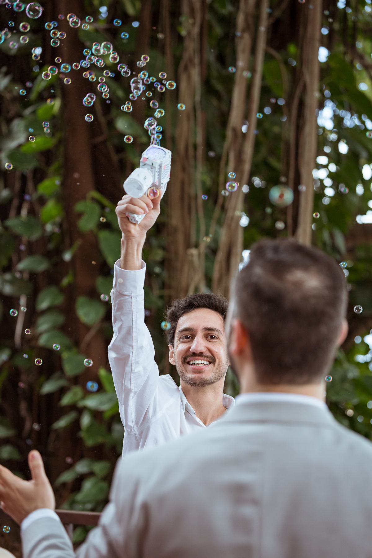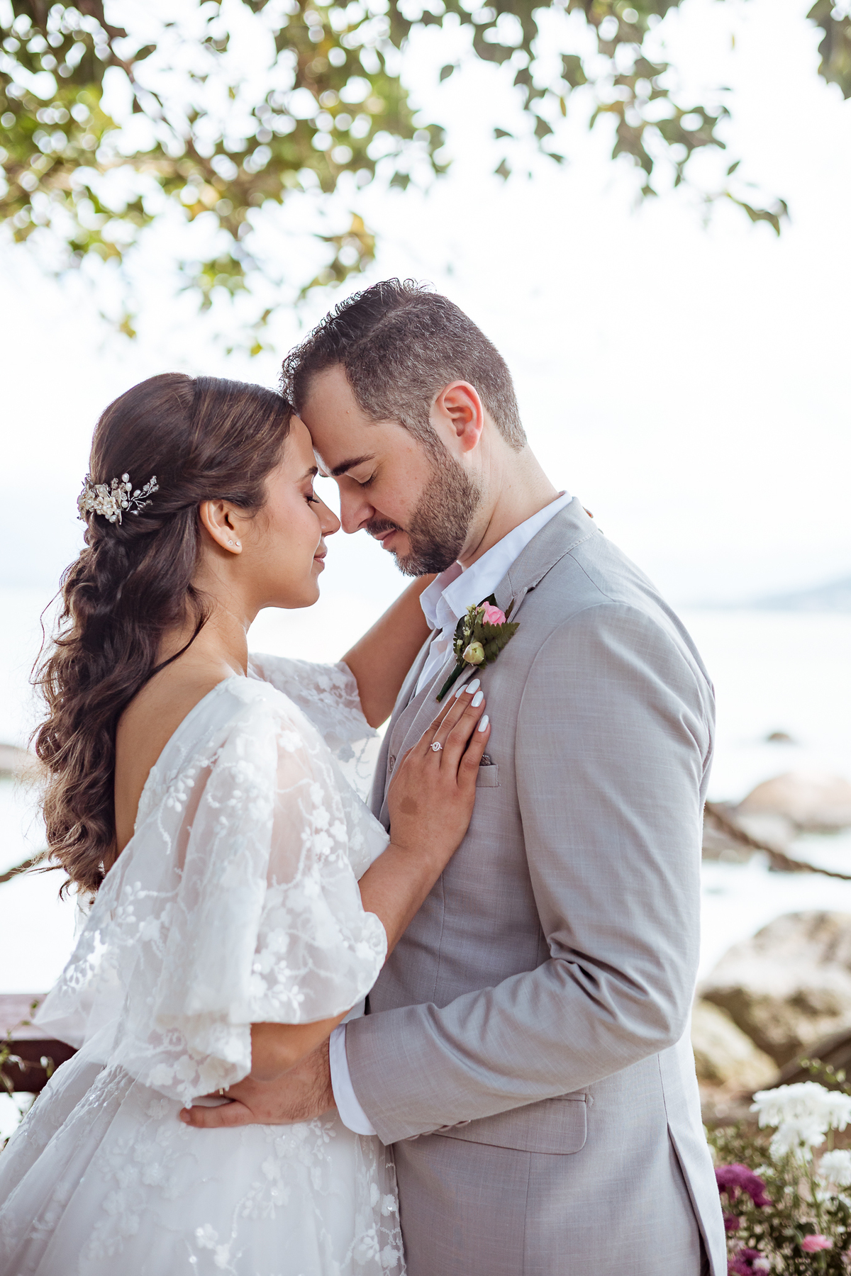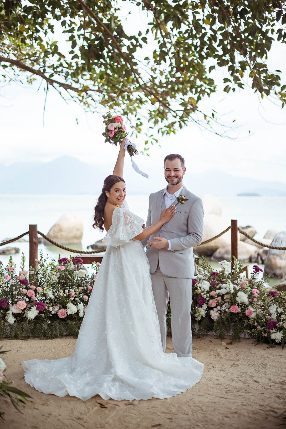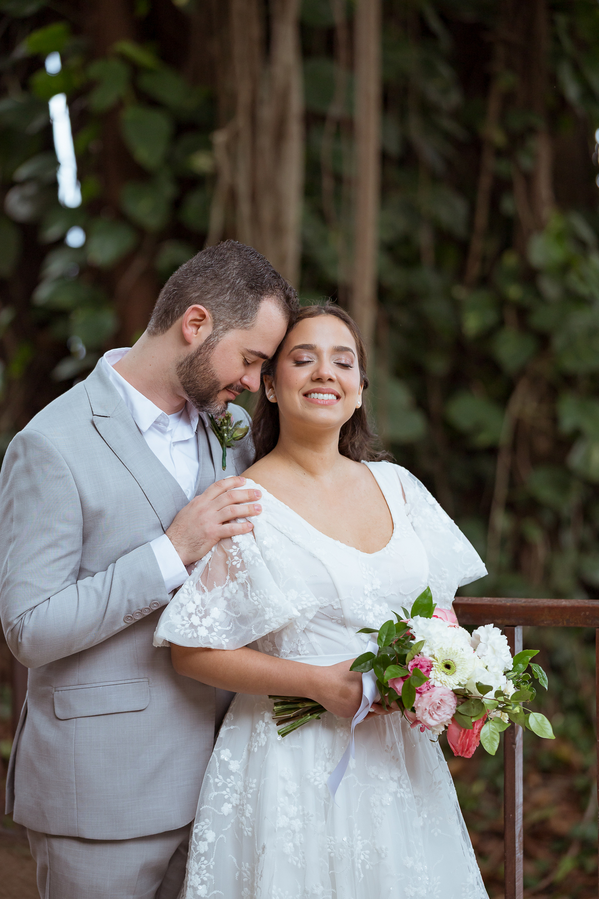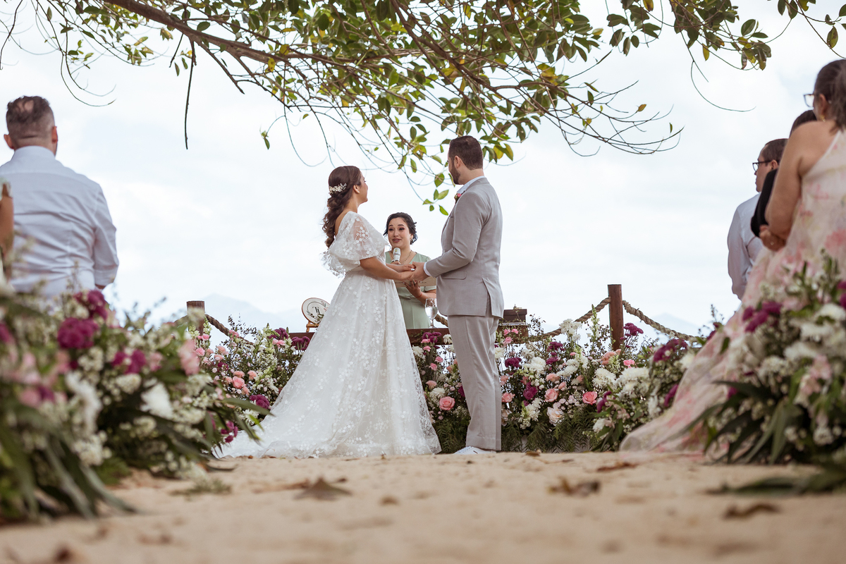 A cerimônia aconteceu em uma manhã de domingo, embaixo de uma árvore no Lusch Garden, com o mar como testemunha. O casal sempre sonhou com um almoço de domingo reunindo família e amigos — e foi exatamente assim: íntimo, afetivo e cheio de leveza.