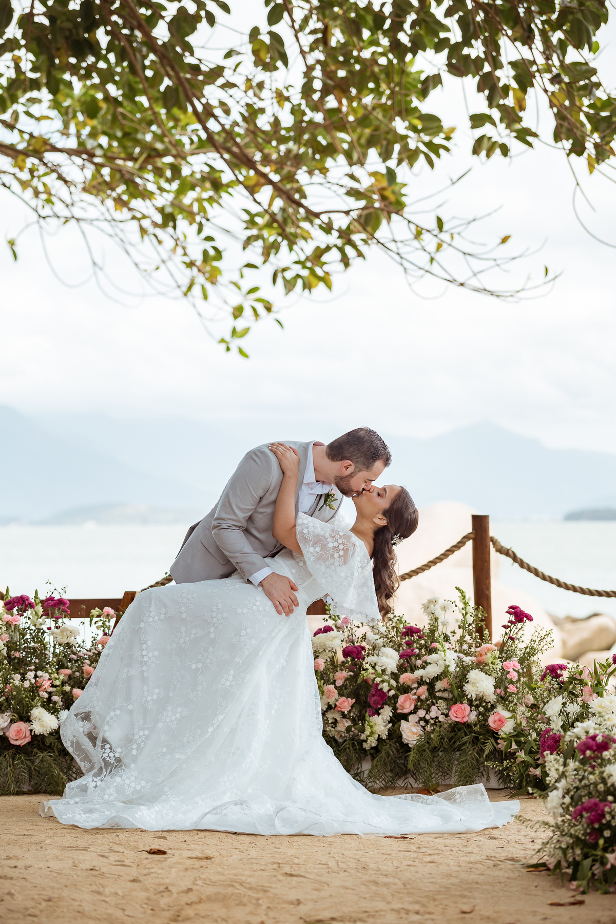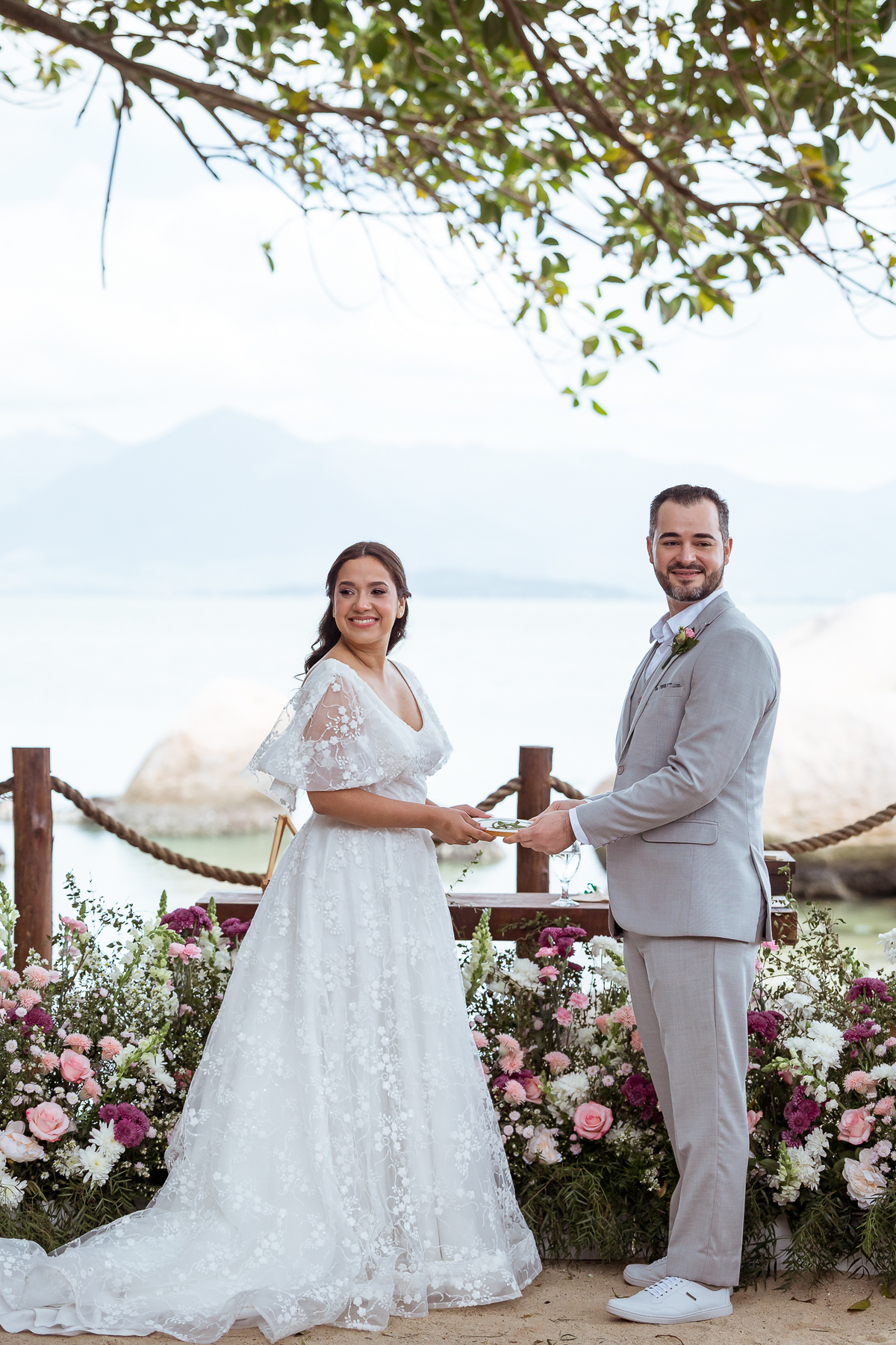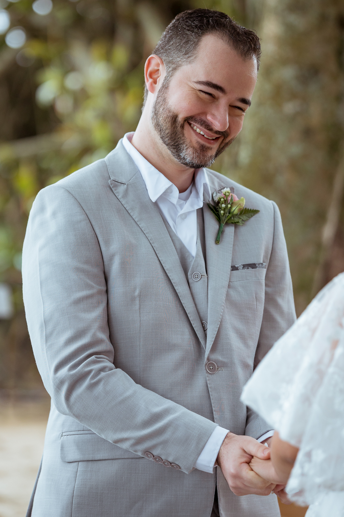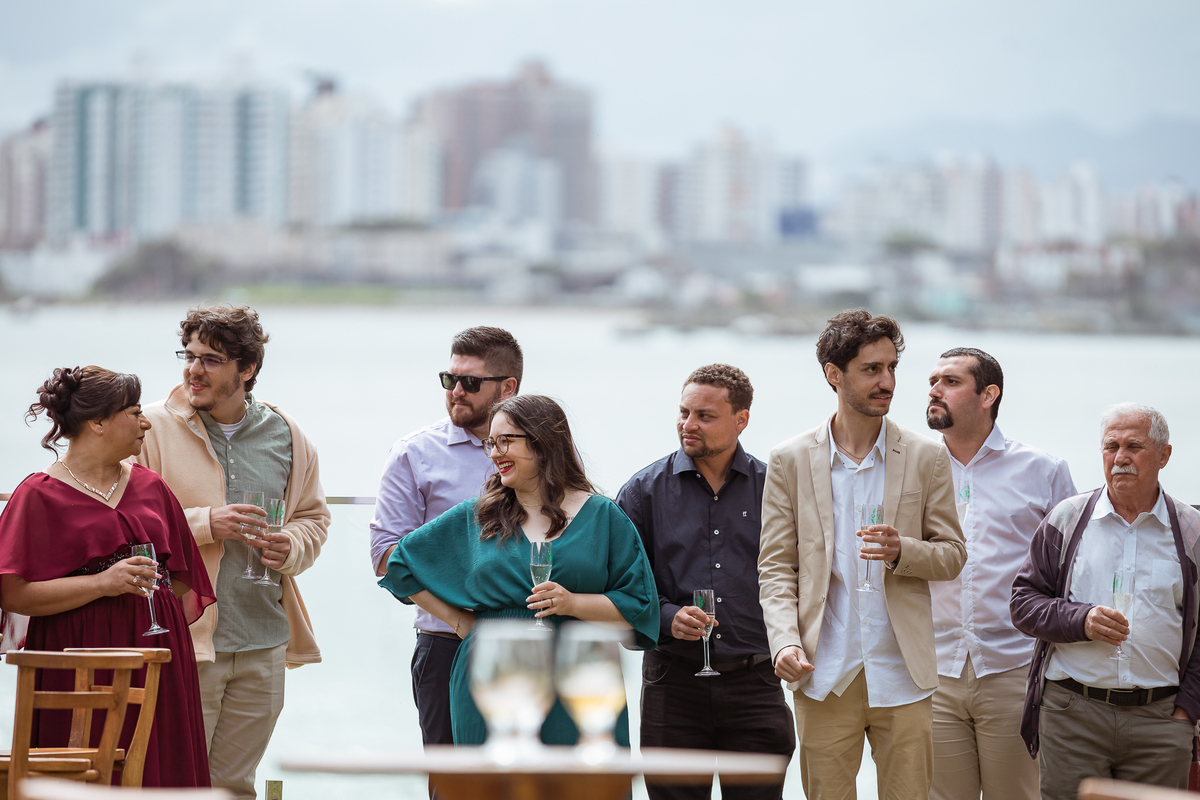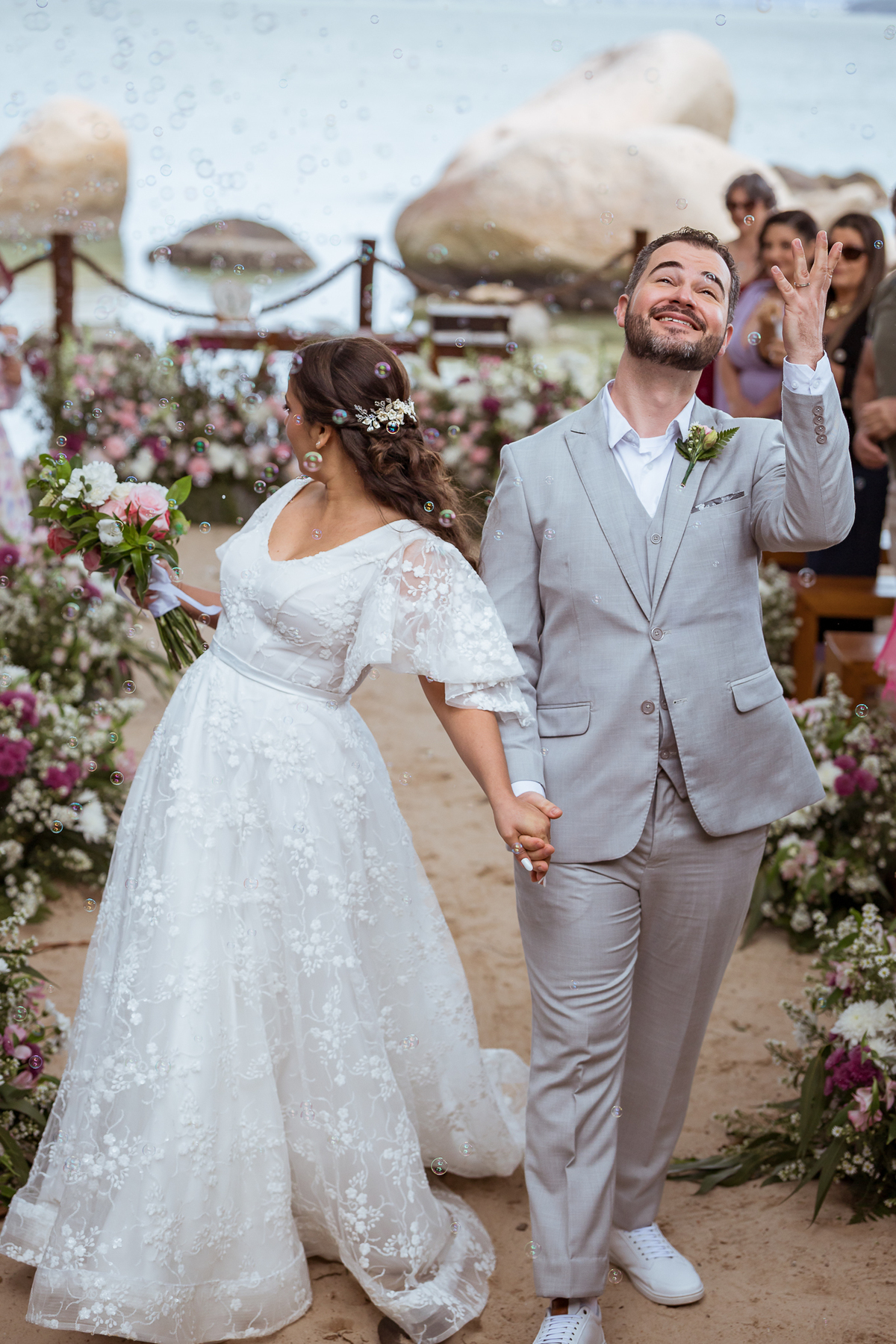 A cerimônia aconteceu em uma manhã de domingo, embaixo de uma árvore no Lusch Garden, com o mar como testemunha. O casal sempre sonhou com um almoço de domingo reunindo família e amigos — e foi exatamente assim: íntimo, afetivo e cheio de leveza.