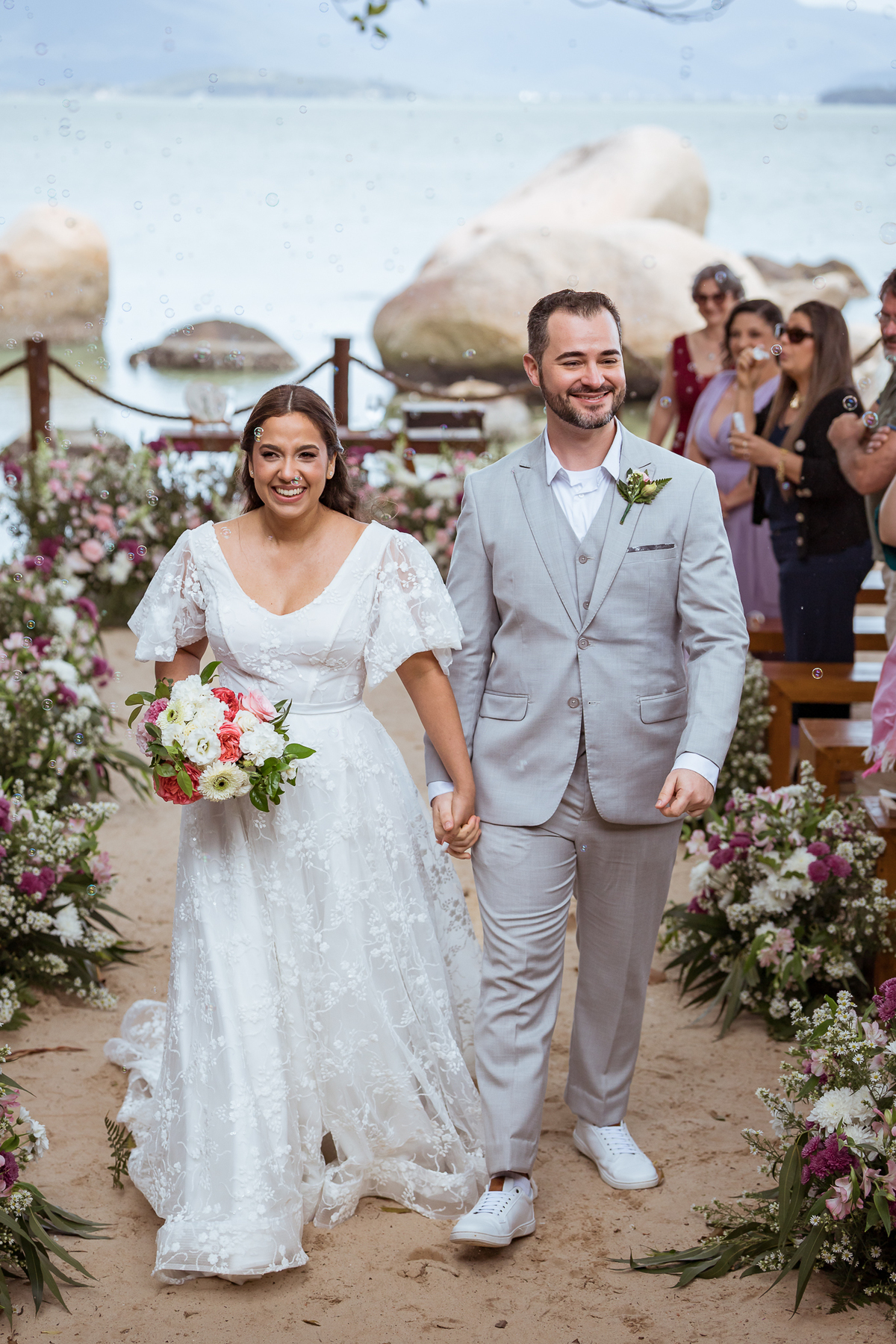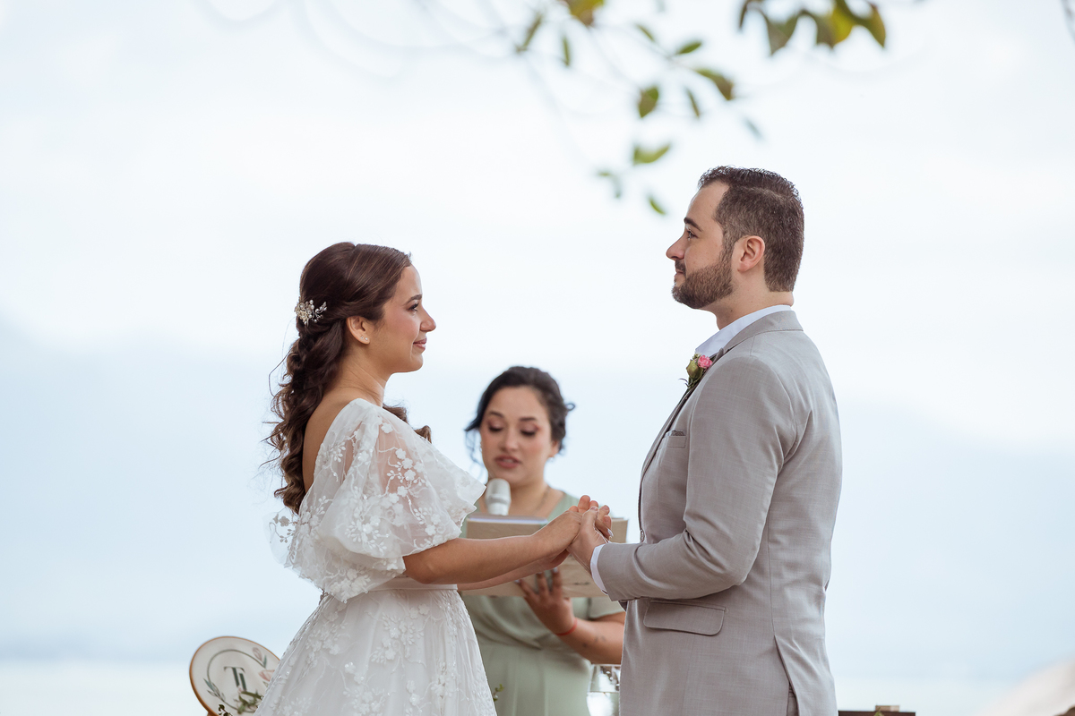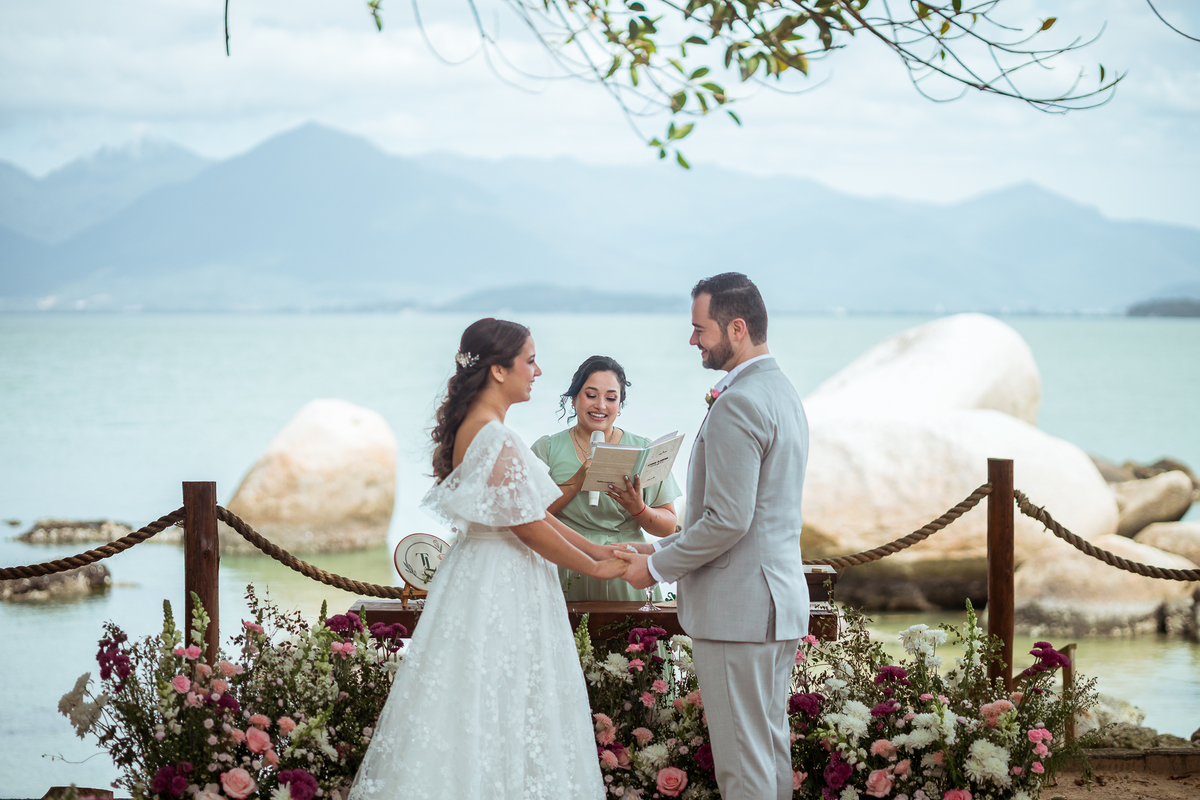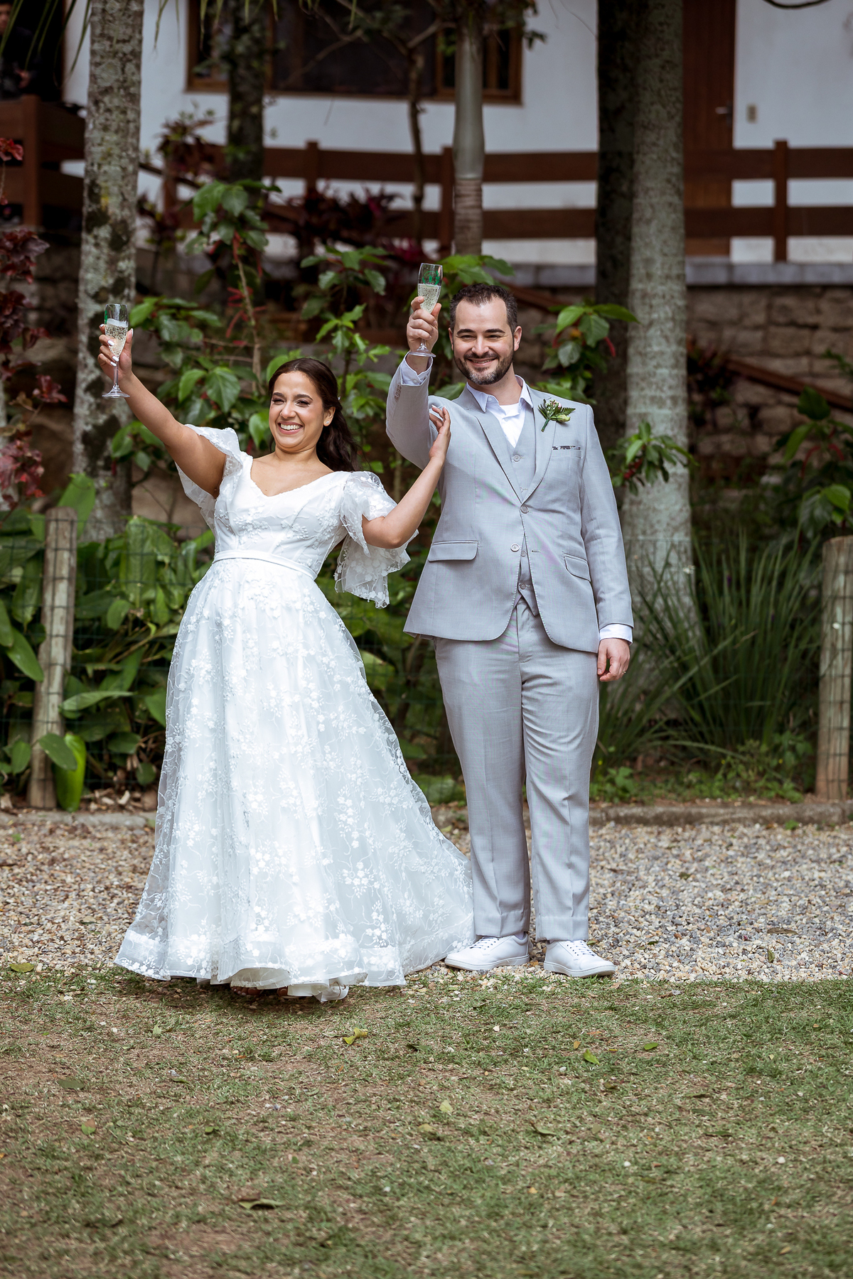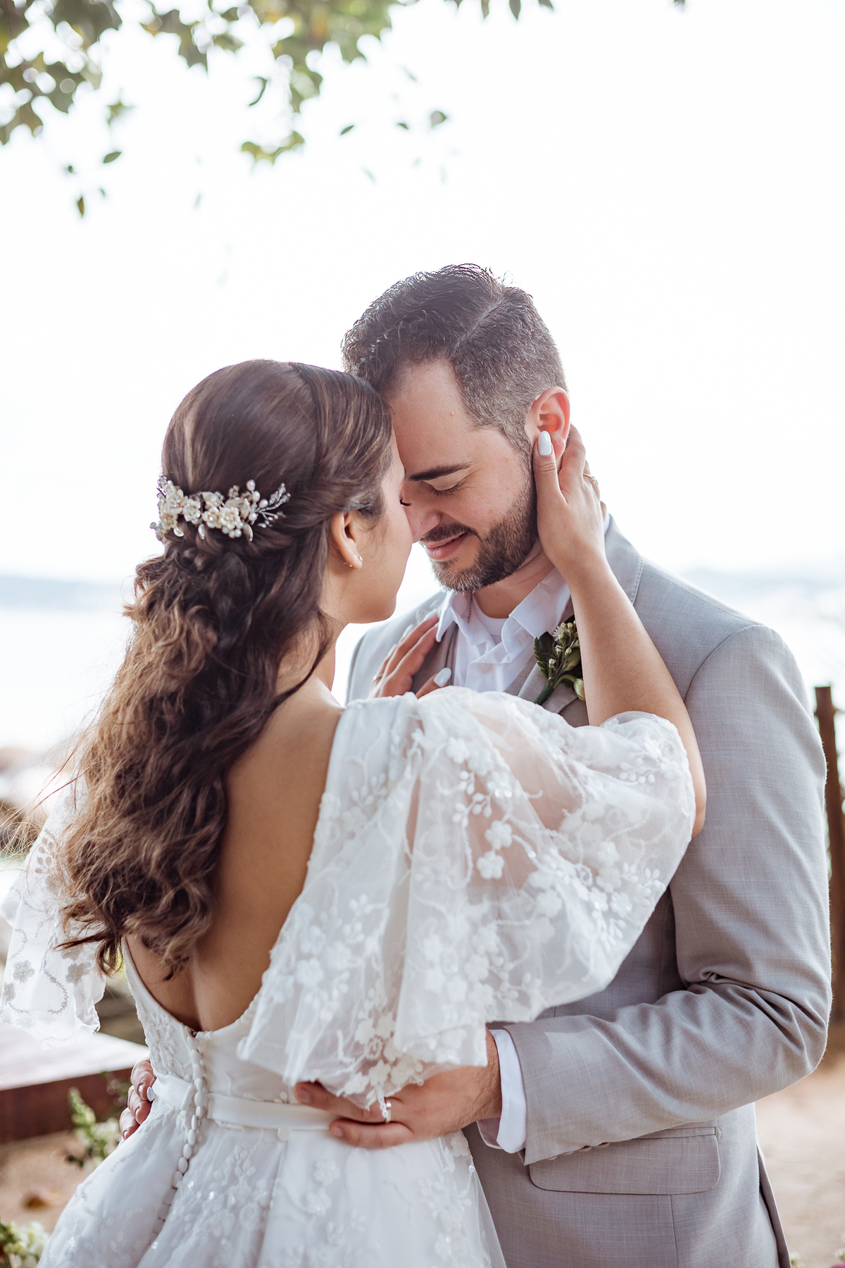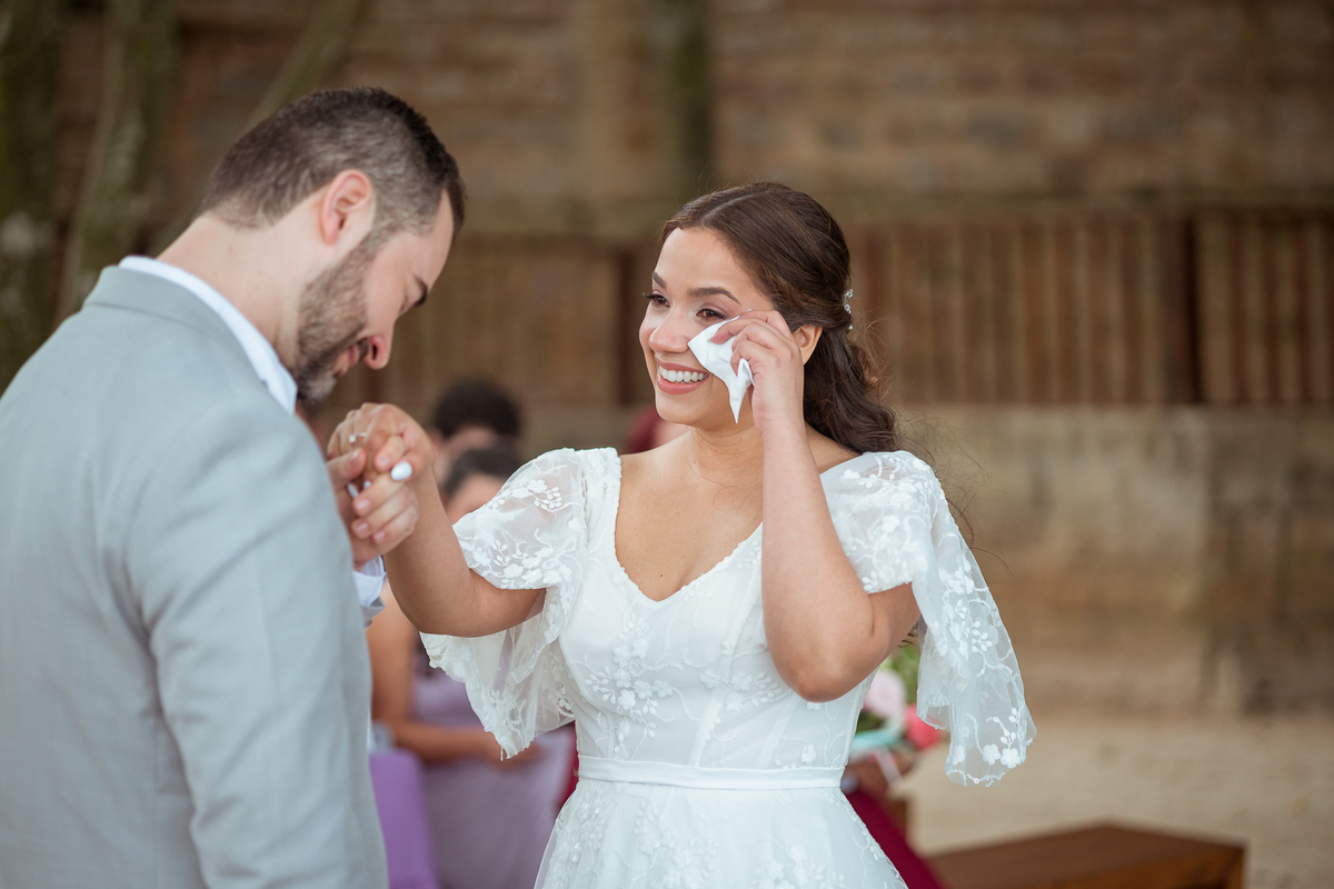 A cerimônia aconteceu em uma manhã de domingo, embaixo de uma árvore no Lusch Garden, com o mar como testemunha. O casal sempre sonhou com um almoço de domingo reunindo família e amigos — e foi exatamente assim: íntimo, afetivo e cheio de leveza.