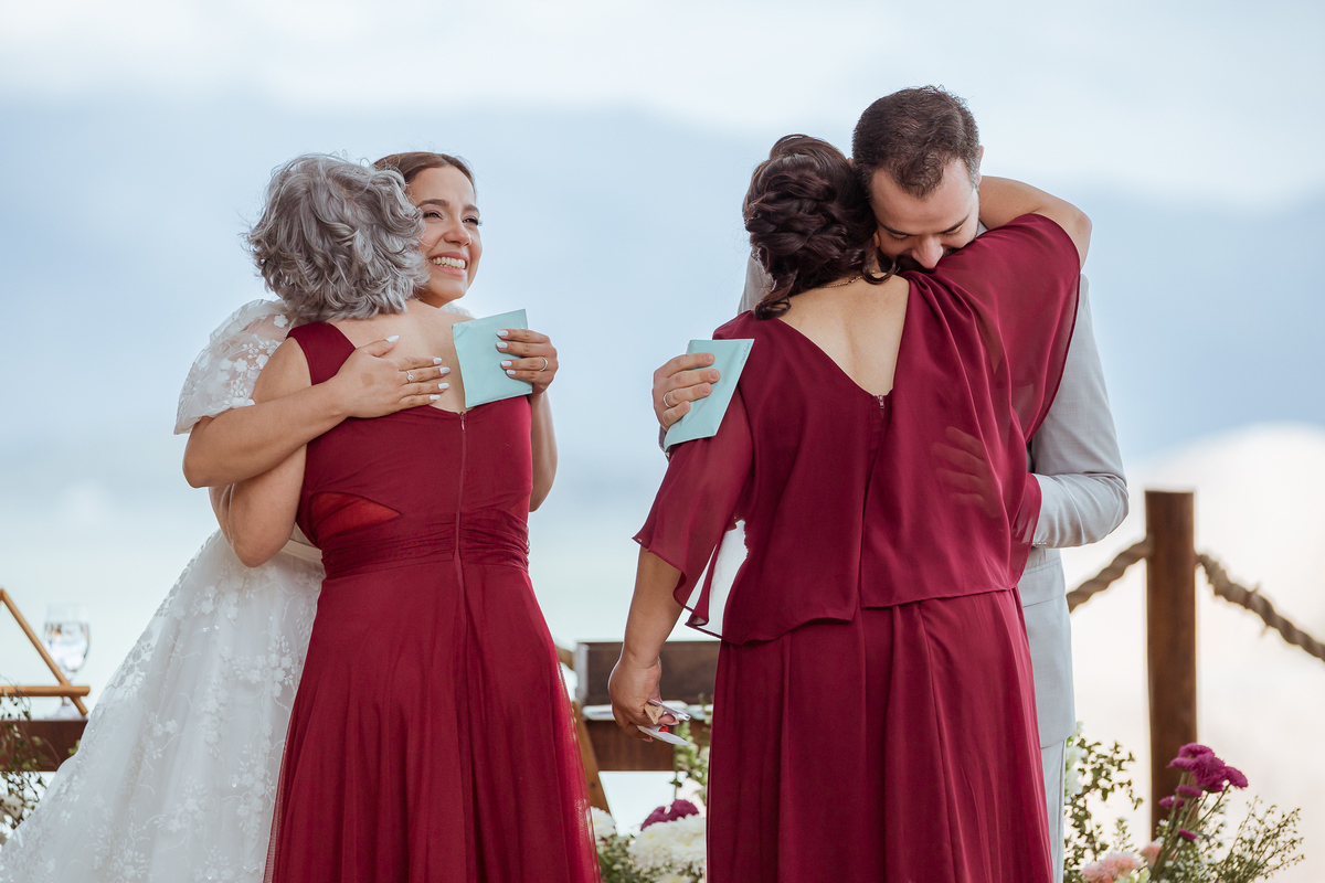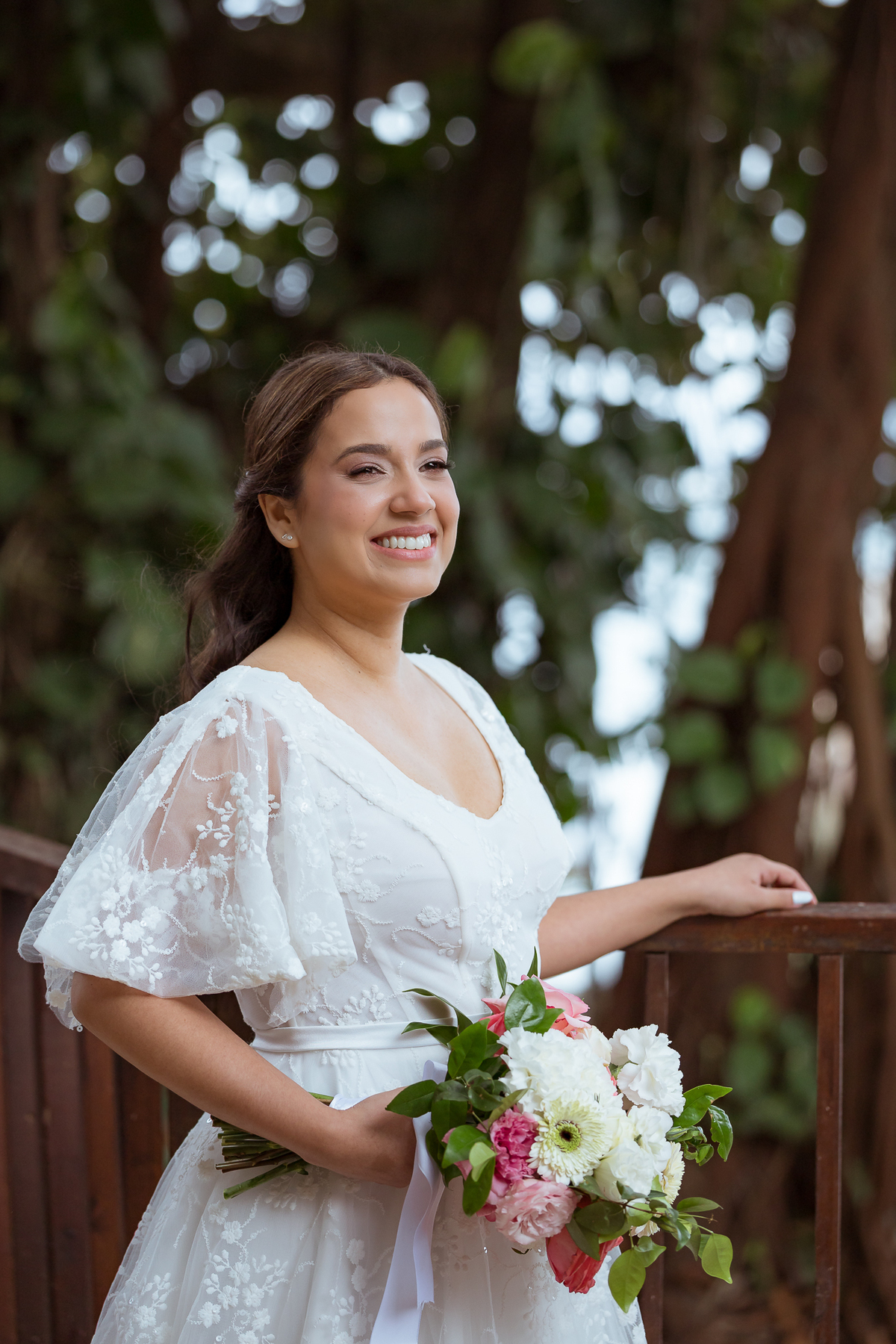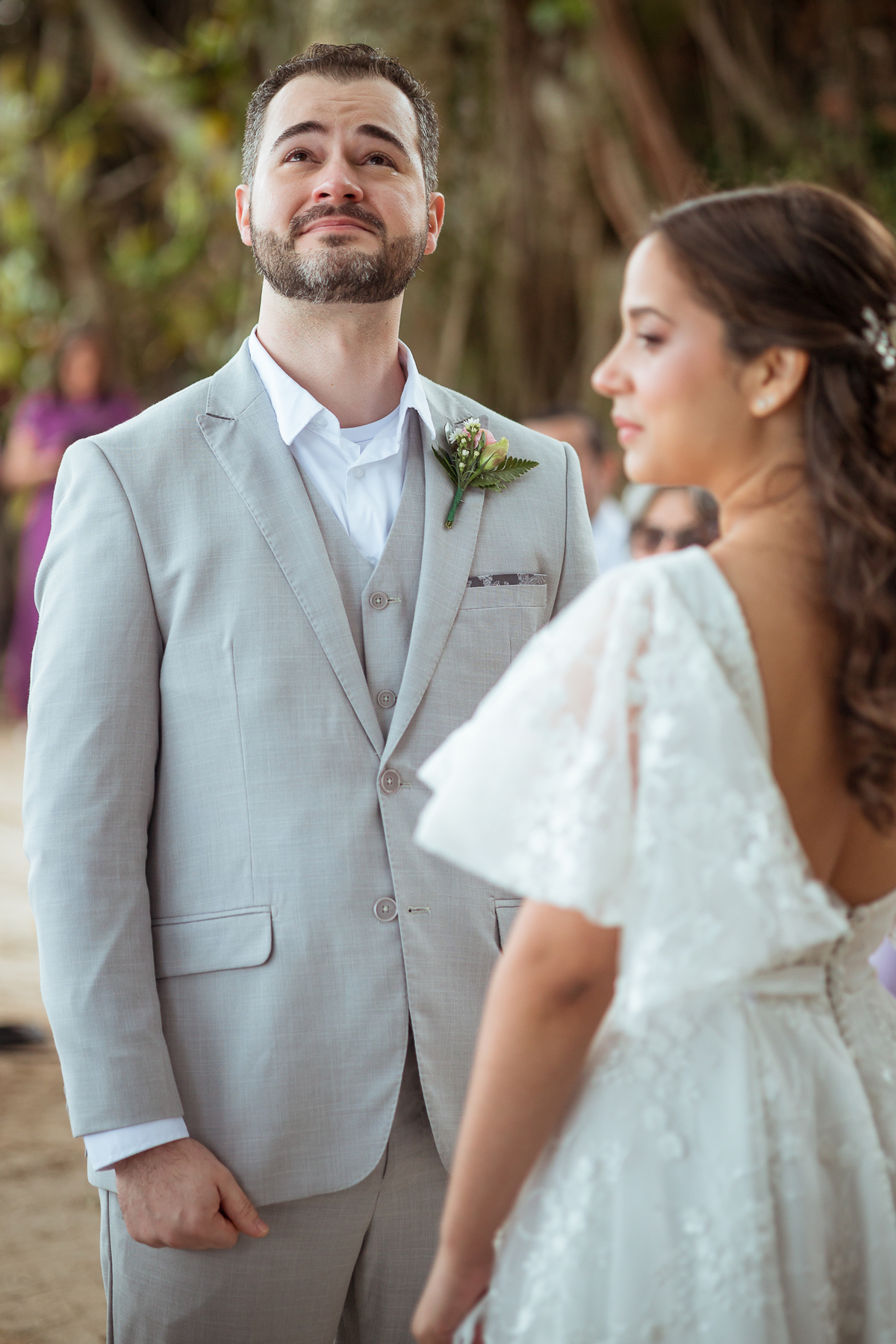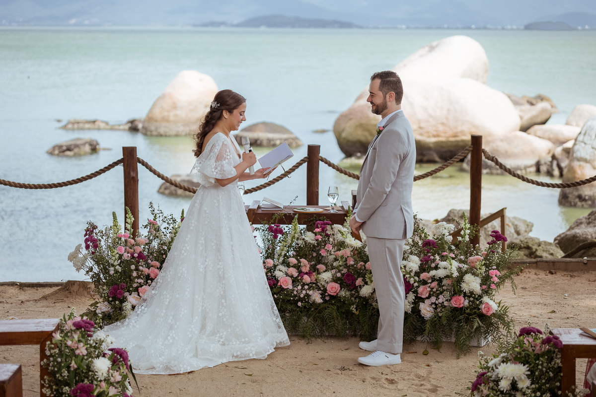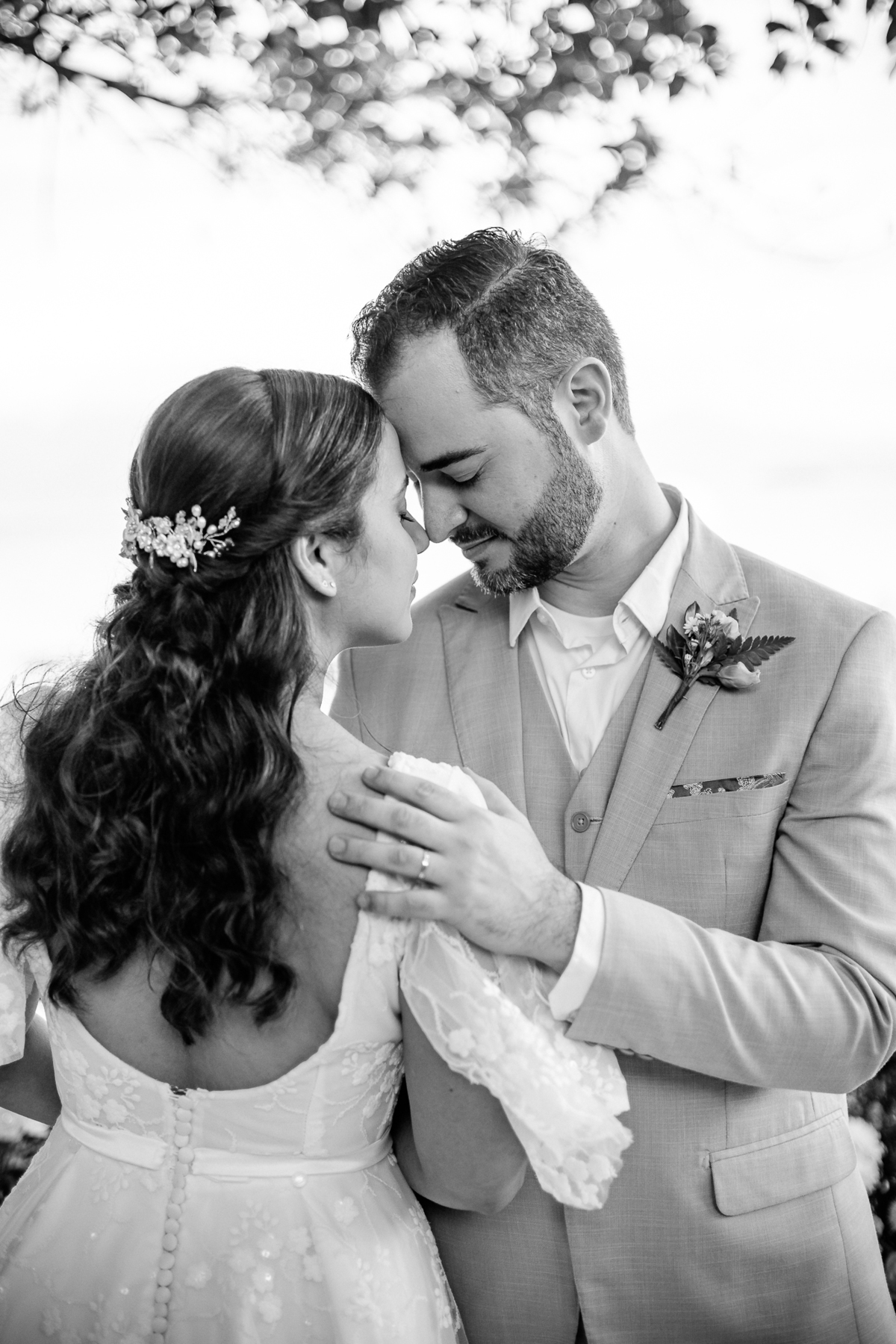 A cerimônia aconteceu em uma manhã de domingo, embaixo de uma árvore no Lusch Garden, com o mar como testemunha. O casal sempre sonhou com um almoço de domingo reunindo família e amigos — e foi exatamente assim: íntimo, afetivo e cheio de leveza.