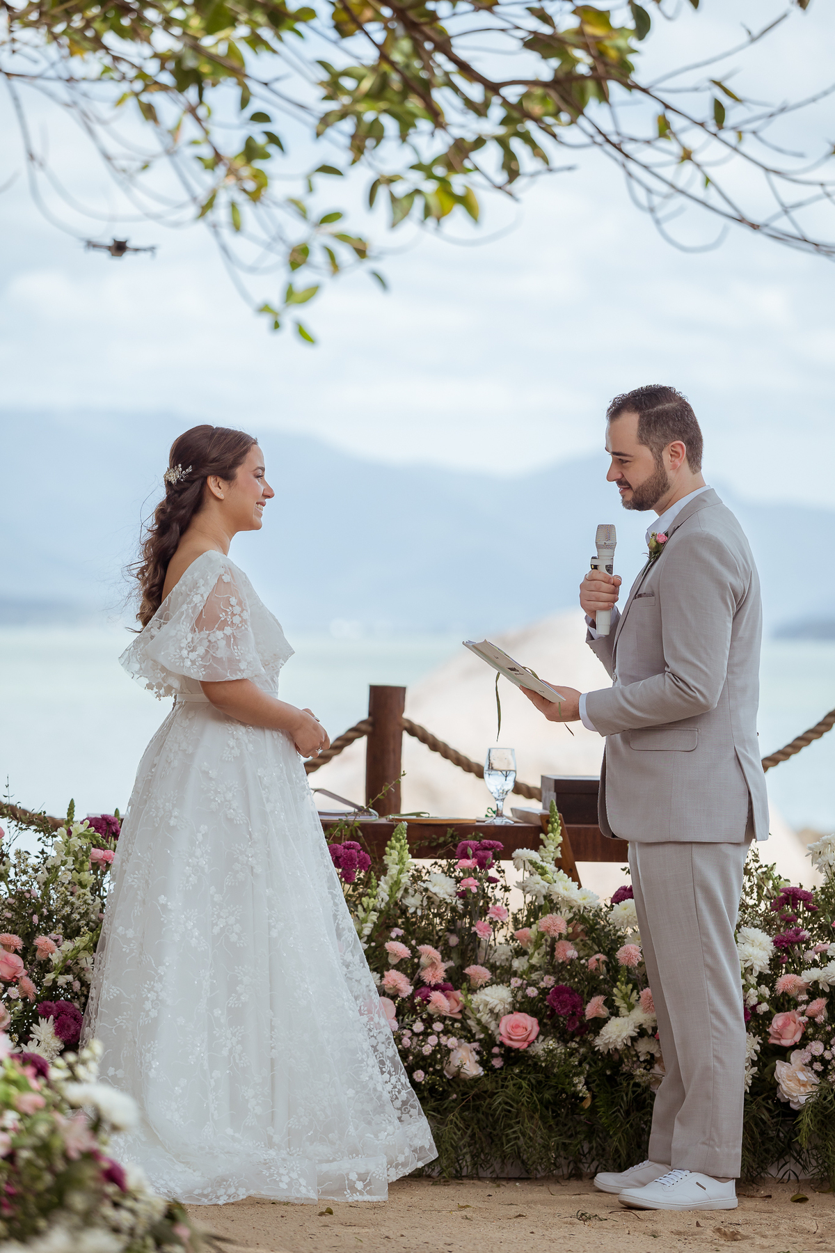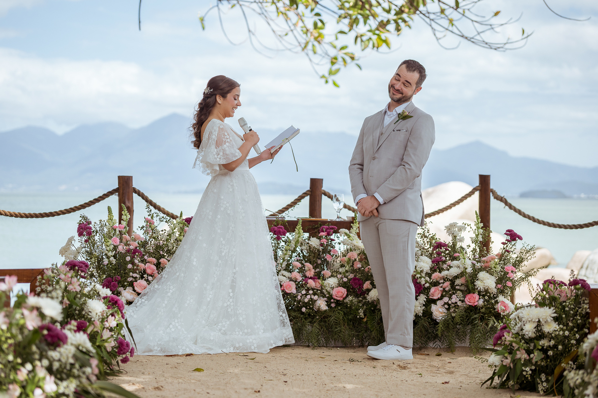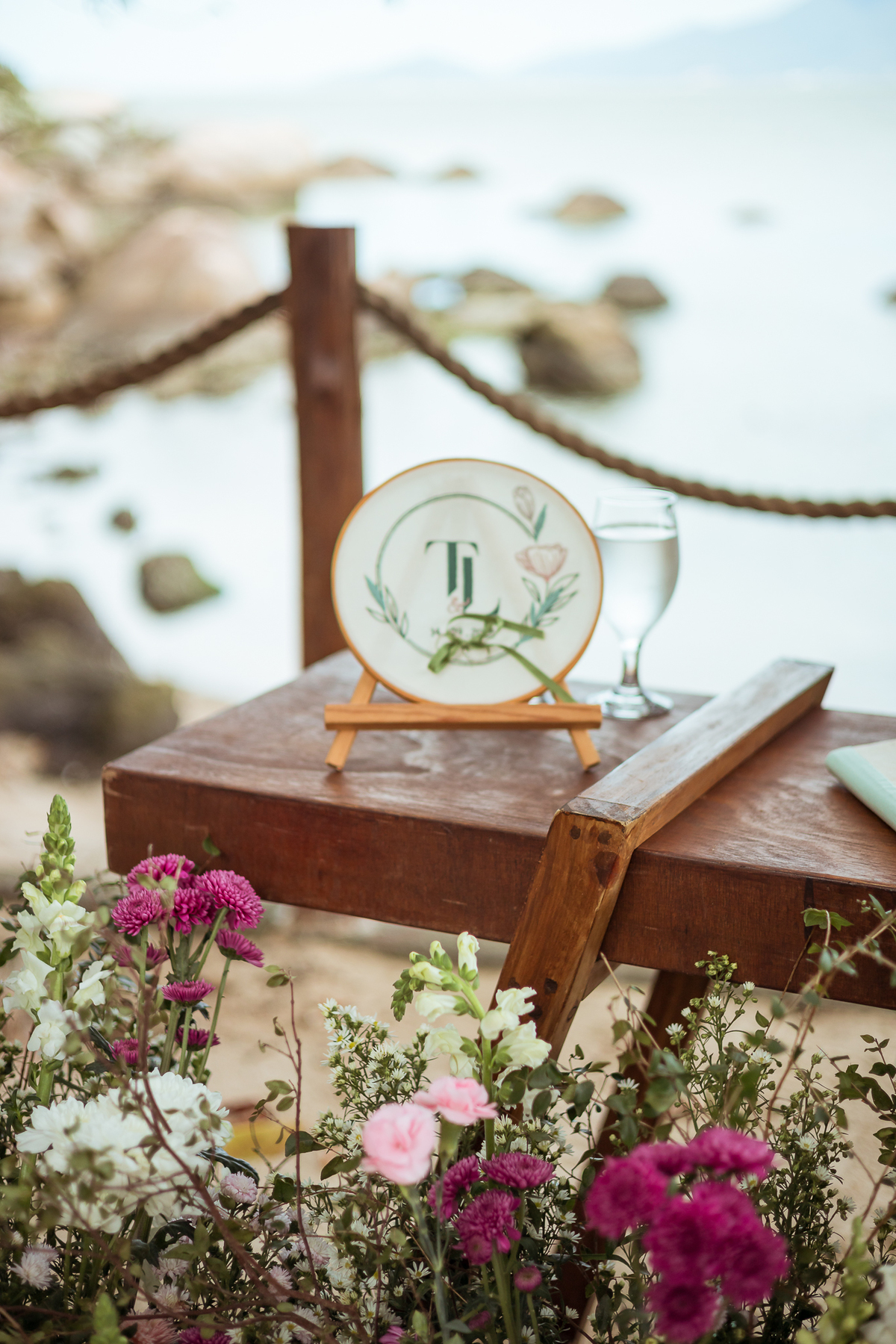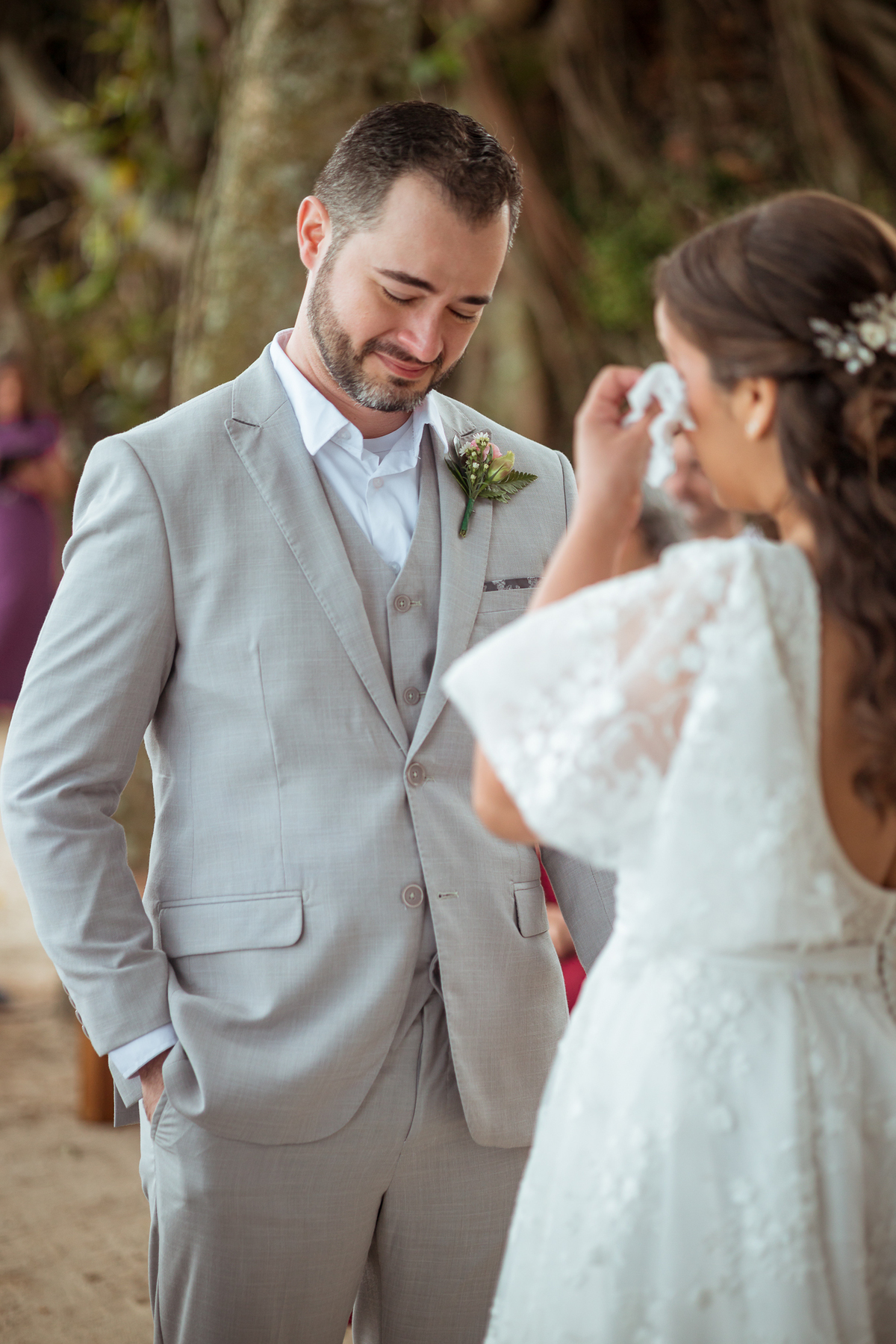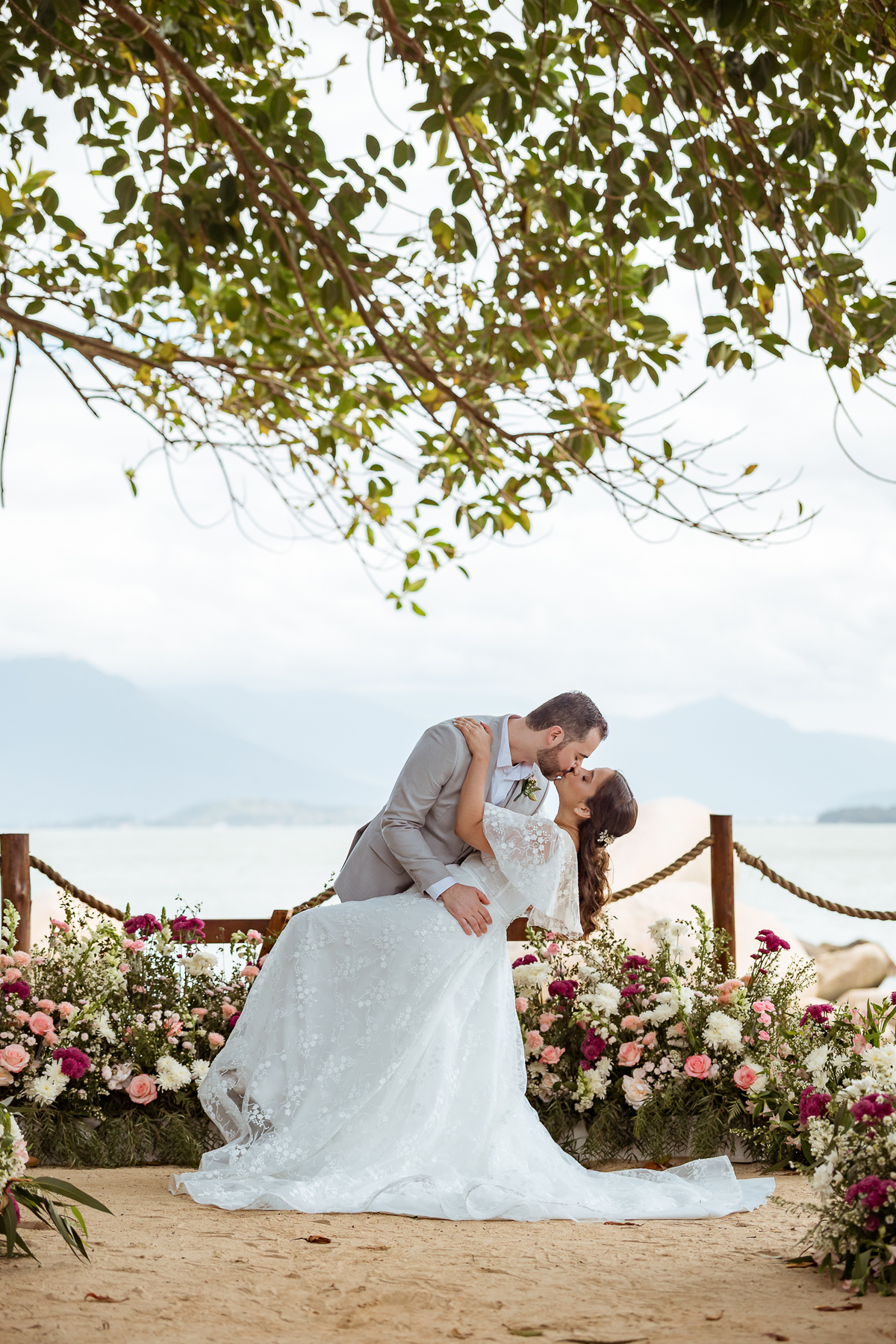 A cerimônia aconteceu em uma manhã de domingo, embaixo de uma árvore no Lusch Garden, com o mar como testemunha. O casal sempre sonhou com um almoço de domingo reunindo família e amigos — e foi exatamente assim: íntimo, afetivo e cheio de leveza.