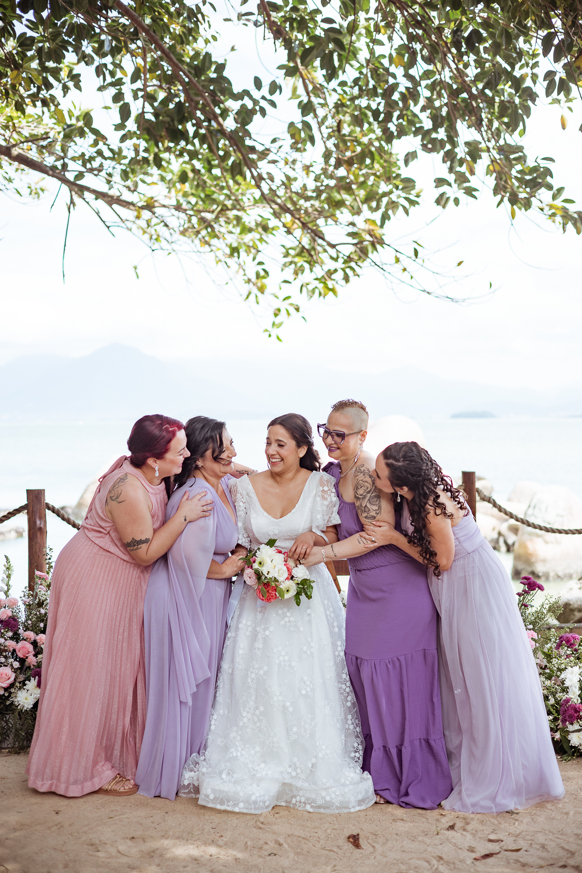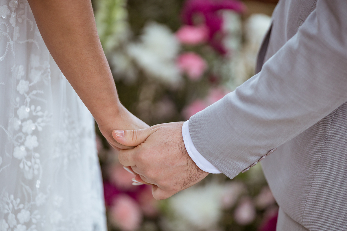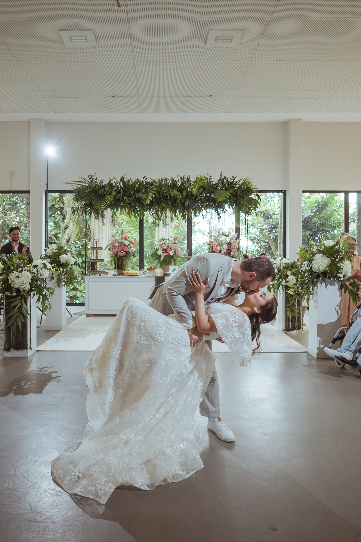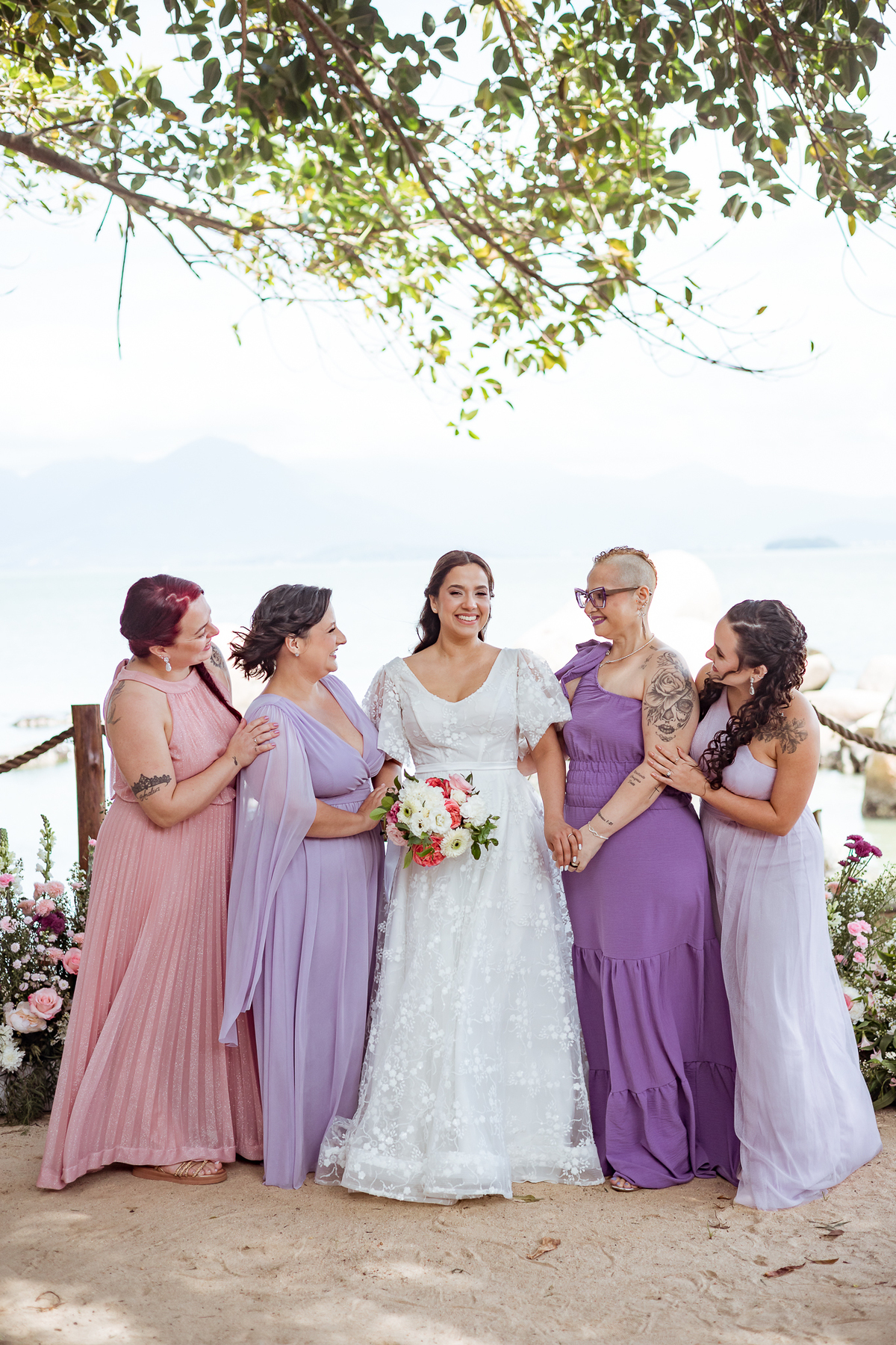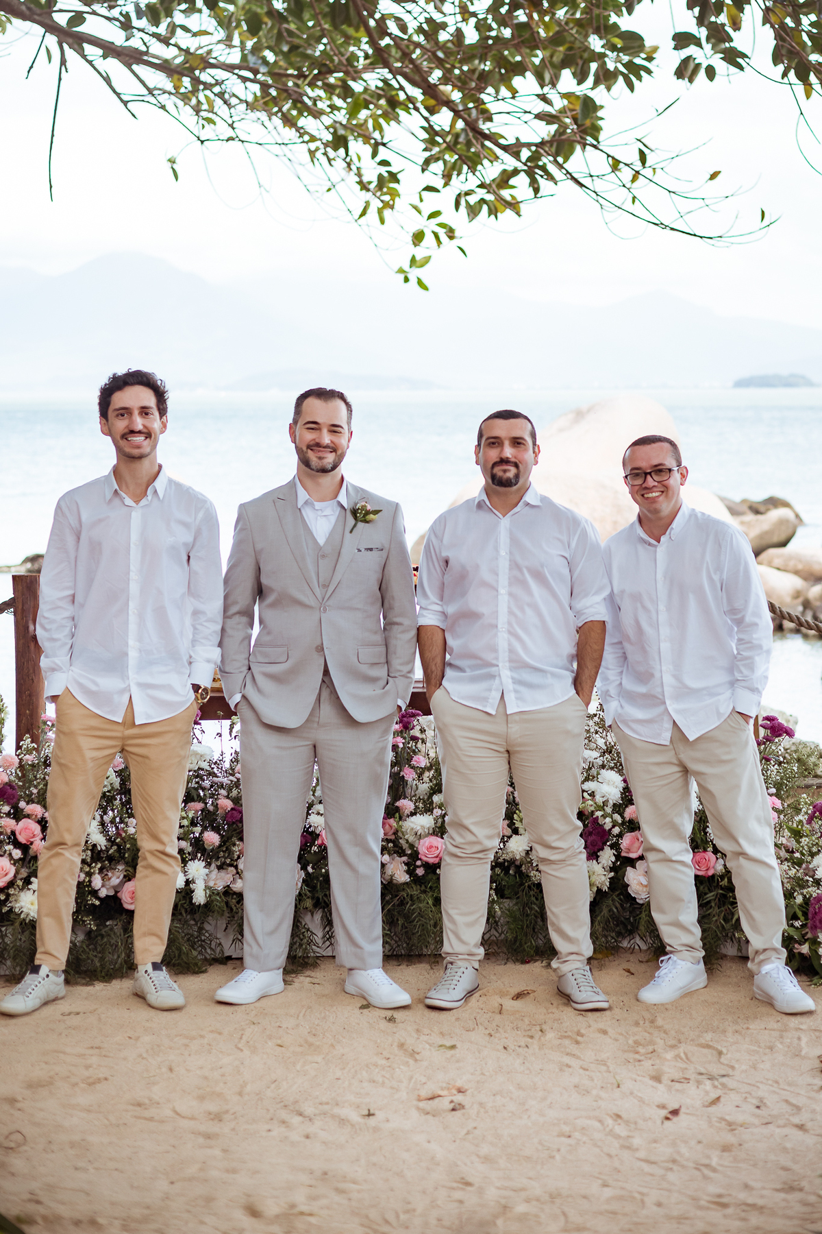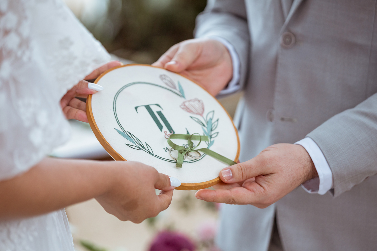 A cerimônia aconteceu em uma manhã de domingo, embaixo de uma árvore no Lusch Garden, com o mar como testemunha. O casal sempre sonhou com um almoço de domingo reunindo família e amigos — e foi exatamente assim: íntimo, afetivo e cheio de leveza.