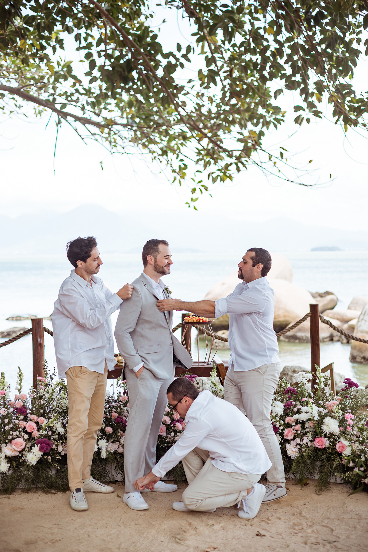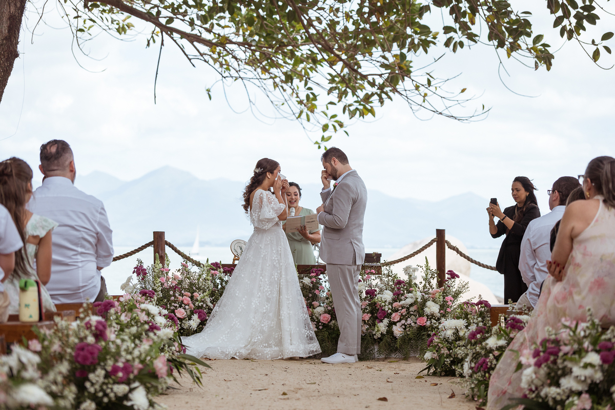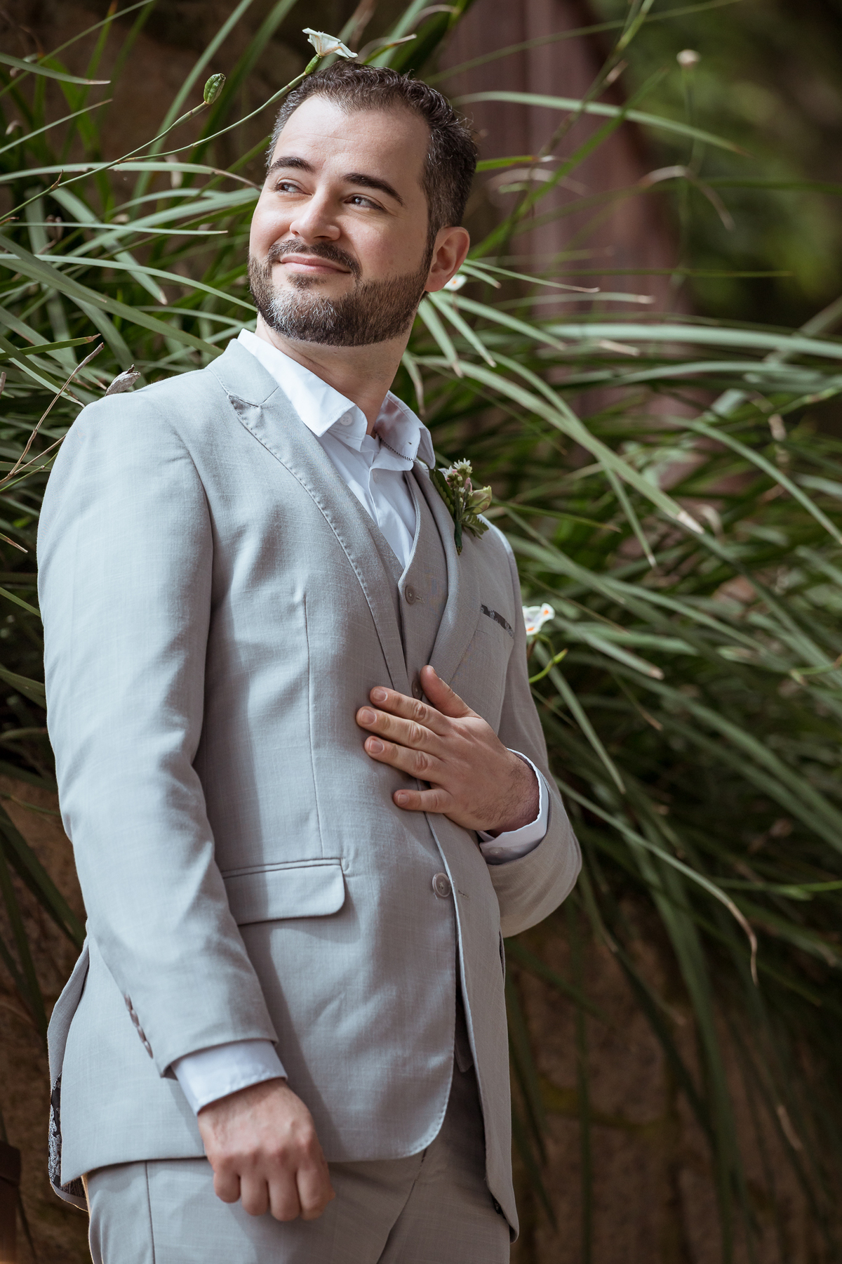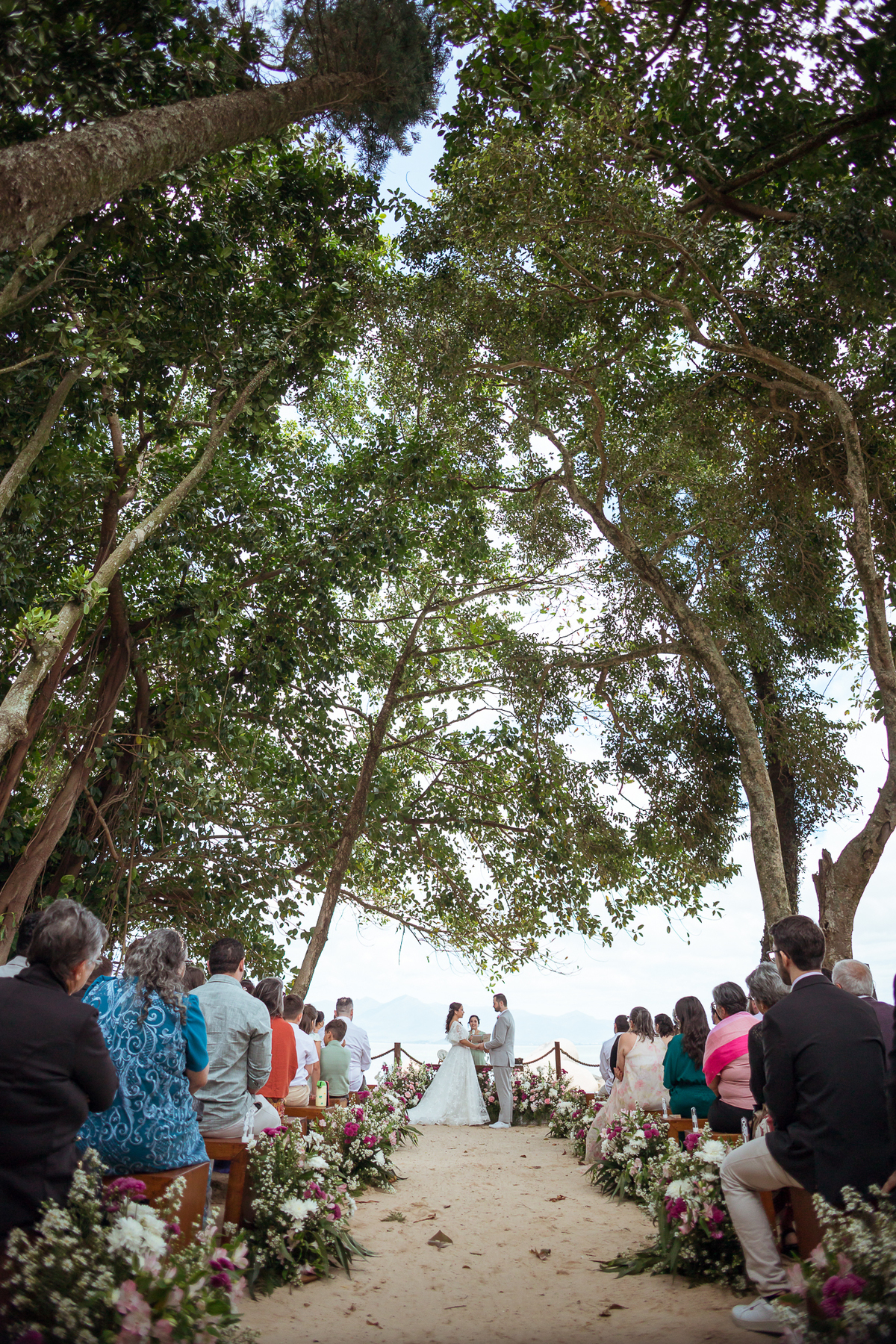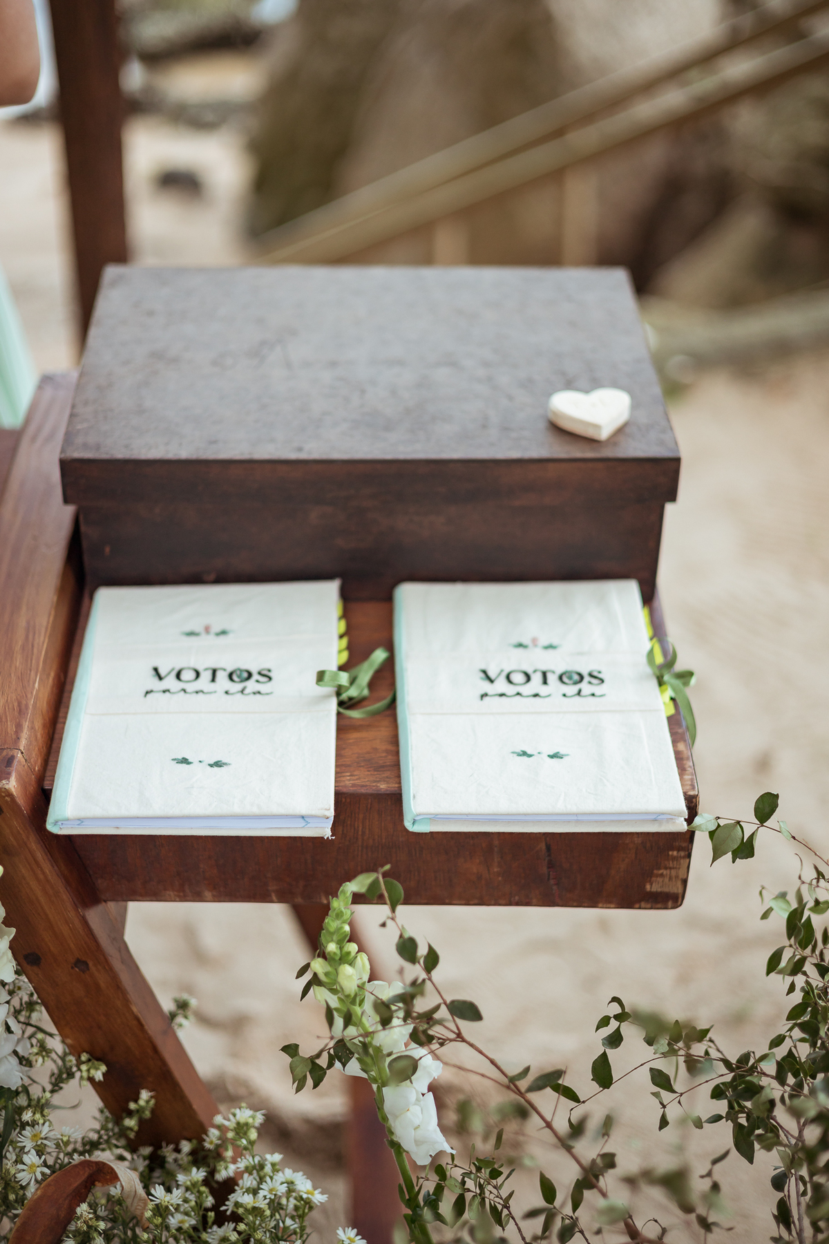 A cerimônia aconteceu em uma manhã de domingo, embaixo de uma árvore no Lusch Garden, com o mar como testemunha. O casal sempre sonhou com um almoço de domingo reunindo família e amigos — e foi exatamente assim: íntimo, afetivo e cheio de leveza.