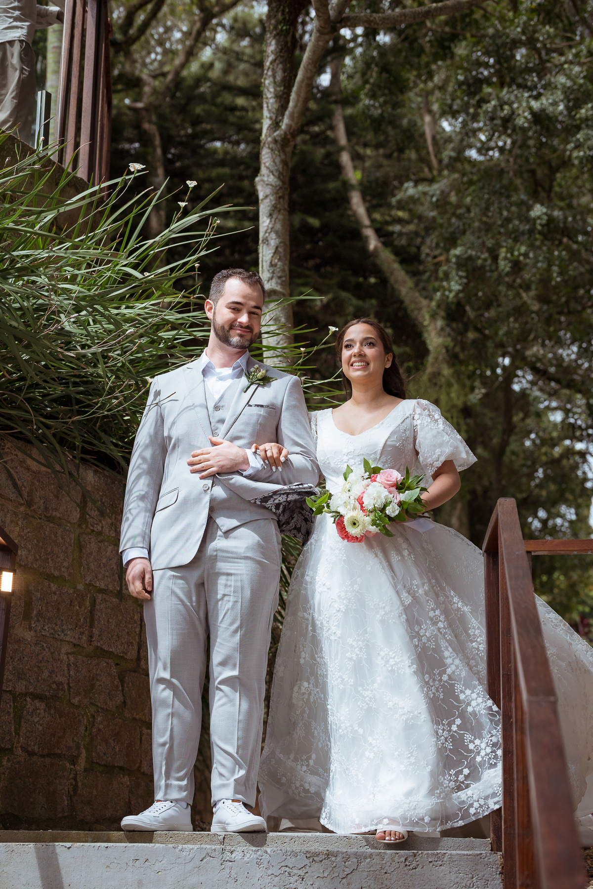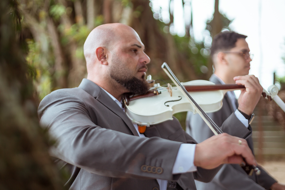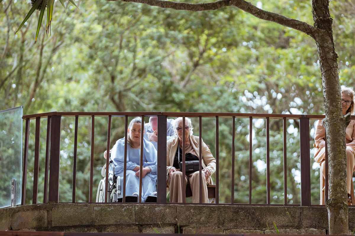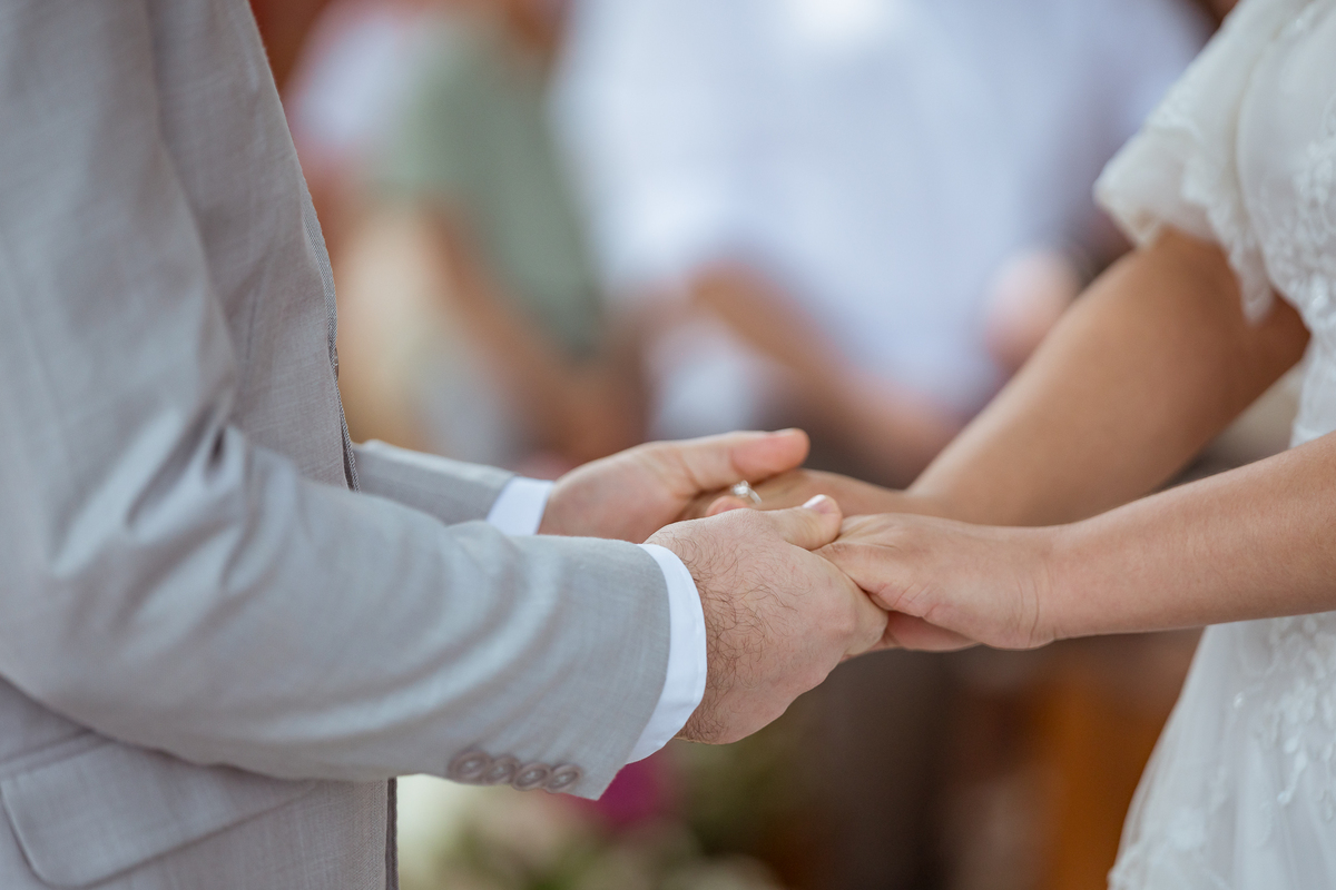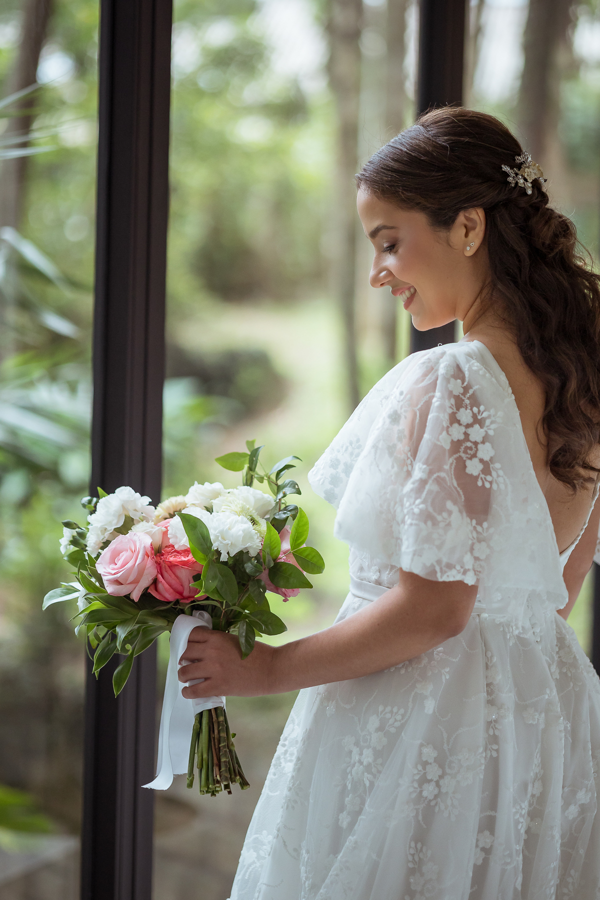 A cerimônia aconteceu em uma manhã de domingo, embaixo de uma árvore no Lusch Garden, com o mar como testemunha. O casal sempre sonhou com um almoço de domingo reunindo família e amigos — e foi exatamente assim: íntimo, afetivo e cheio de leveza.