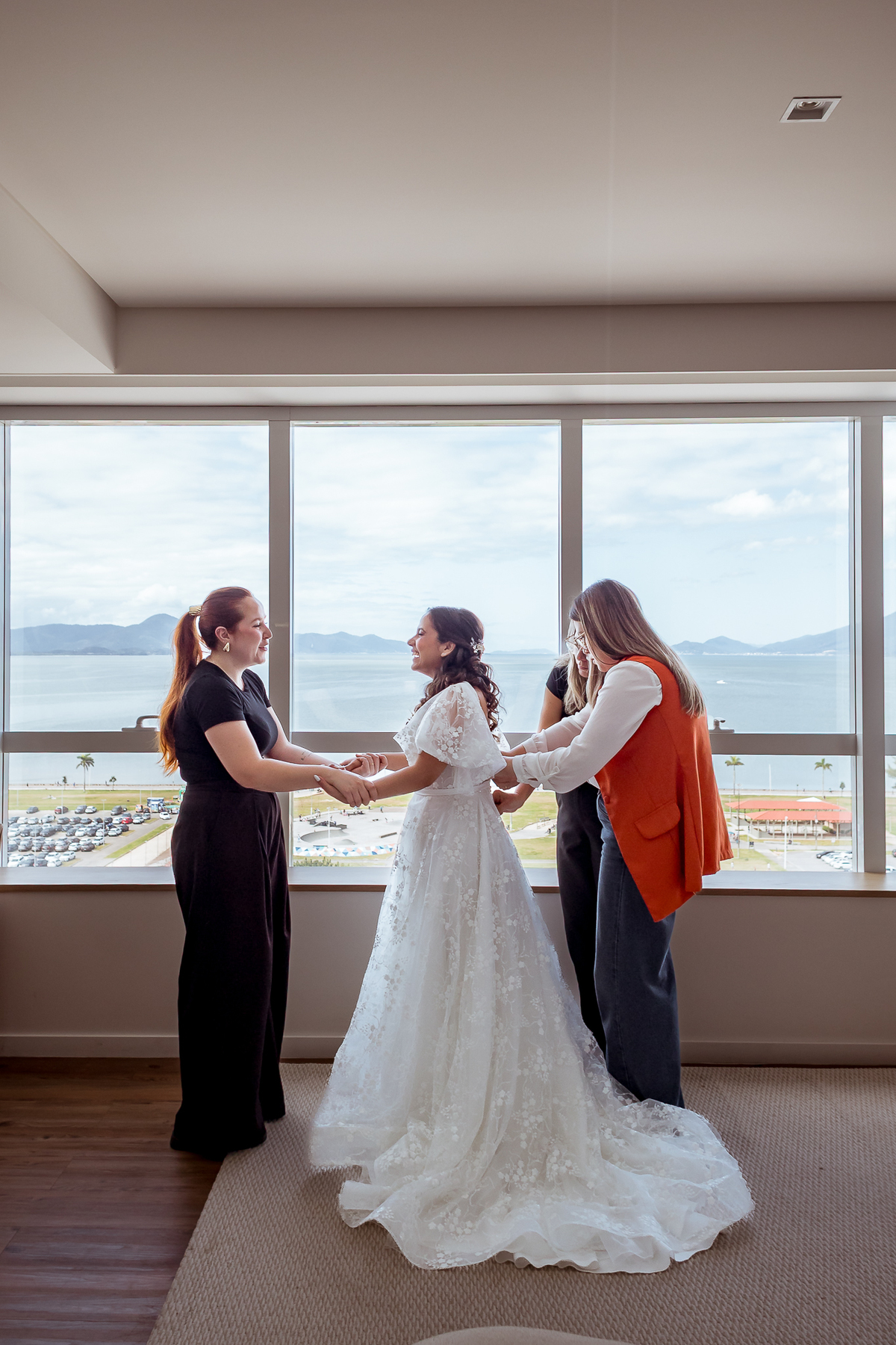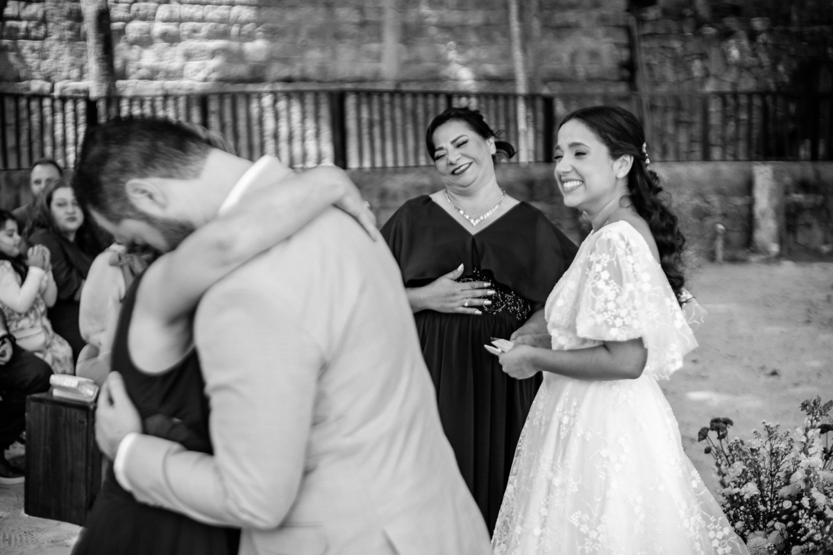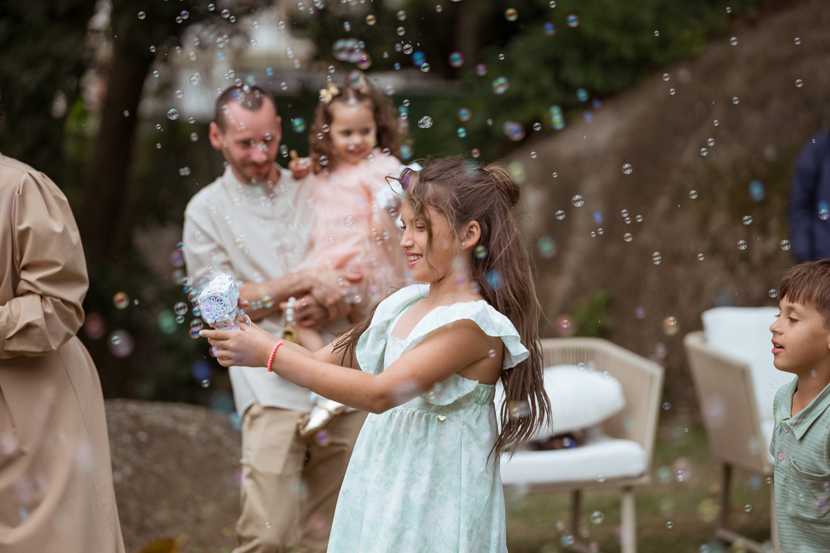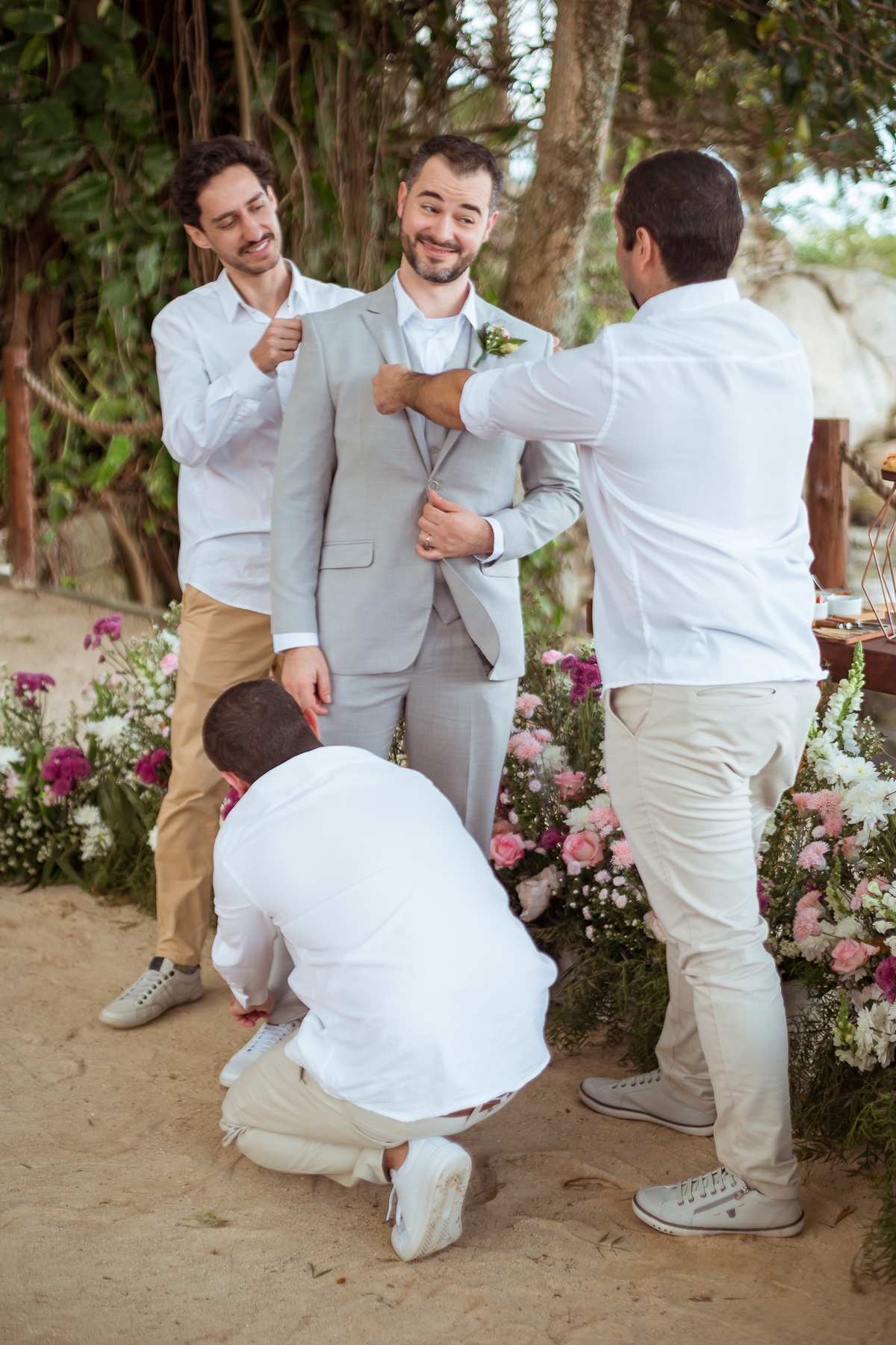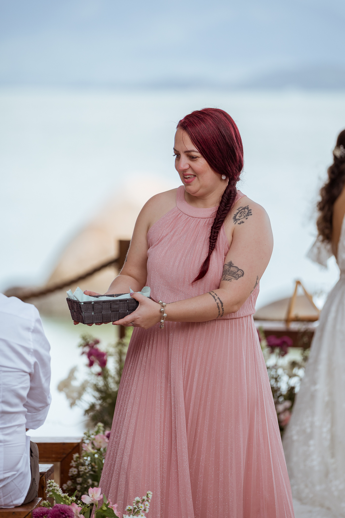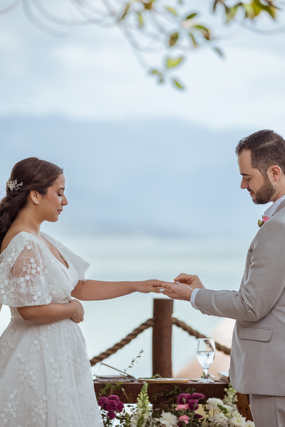 A cerimônia aconteceu em uma manhã de domingo, embaixo de uma árvore no Lusch Garden, com o mar como testemunha. O casal sempre sonhou com um almoço de domingo reunindo família e amigos — e foi exatamente assim: íntimo, afetivo e cheio de leveza.