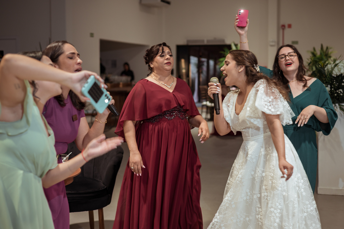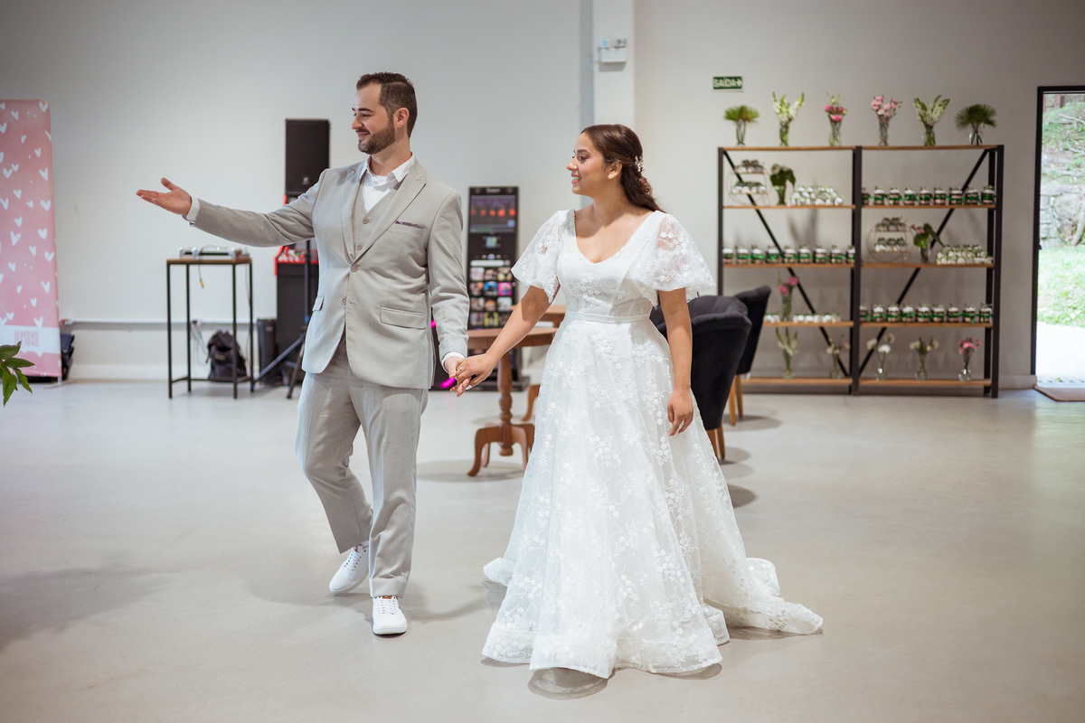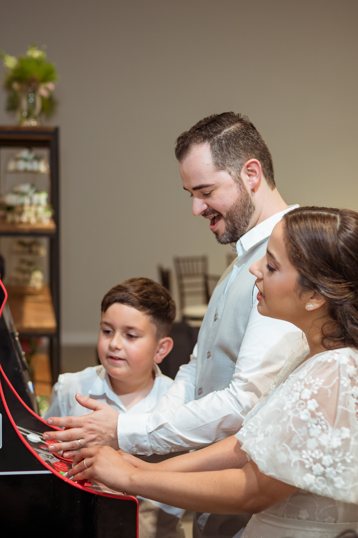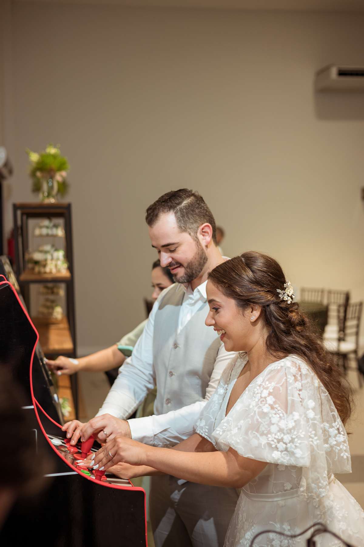 No salão, em vez de uma festa tradicional, o casal optou por um clima descontraído: depois da dança dos noivos, todos se divertiram no karaokê, no fliperama e na cabine de fotos onde absolutamente todos os convidados fizeram fotos (e amaram). Teve sorvete, comida deliciosa e até bolo individual para cada convidado, preparado com carinho.
