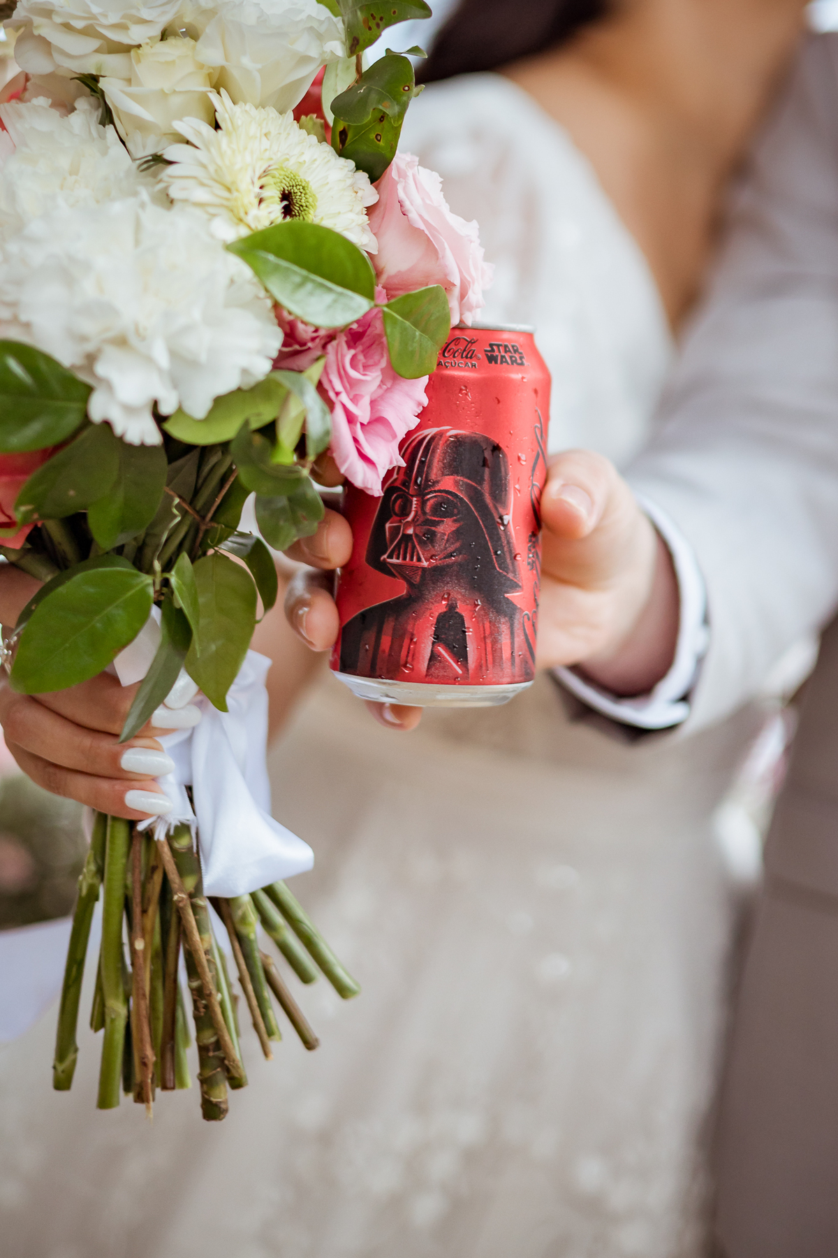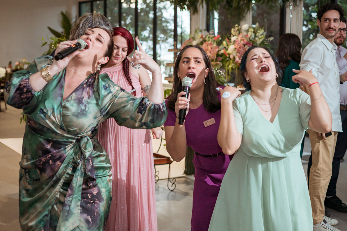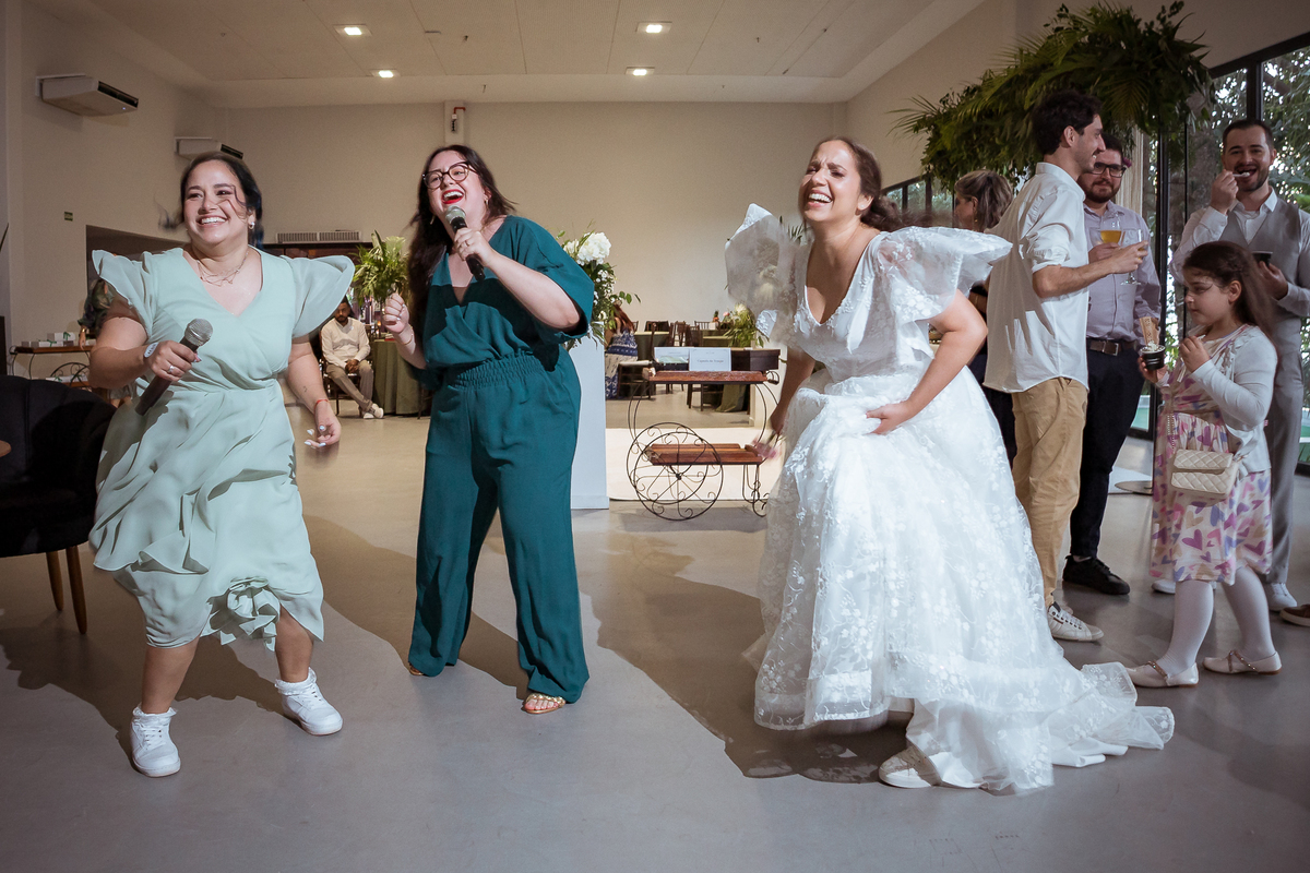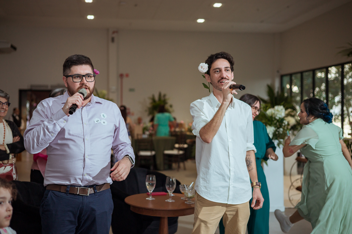 No salão, em vez de uma festa tradicional, o casal optou por um clima descontraído: depois da dança dos noivos, todos se divertiram no karaokê, no fliperama e na cabine de fotos onde absolutamente todos os convidados fizeram fotos (e amaram). Teve sorvete, comida deliciosa e até bolo individual para cada convidado, preparado com carinho.
