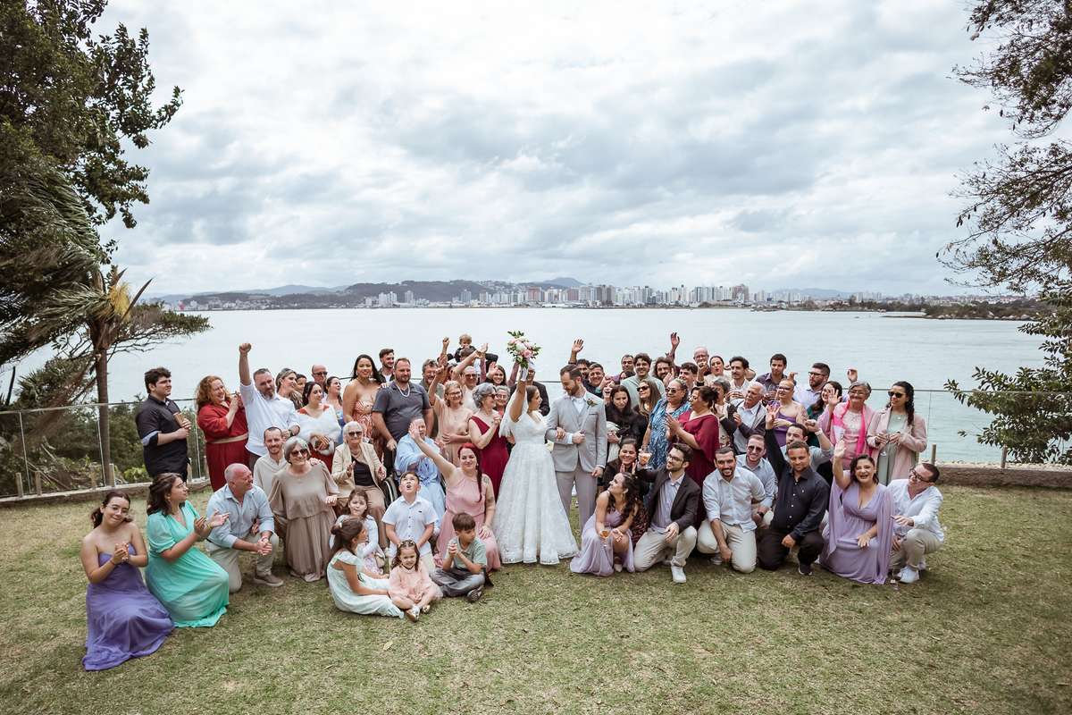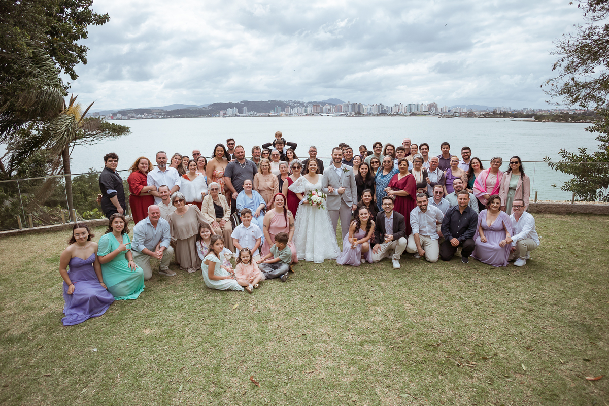 Após a cerimônia, no gramado do Lusch Garden, os noivos receberam os abraços dos convidados e registramos uma linda foto de todos juntos — lembrança que ficará para sempre guardada.