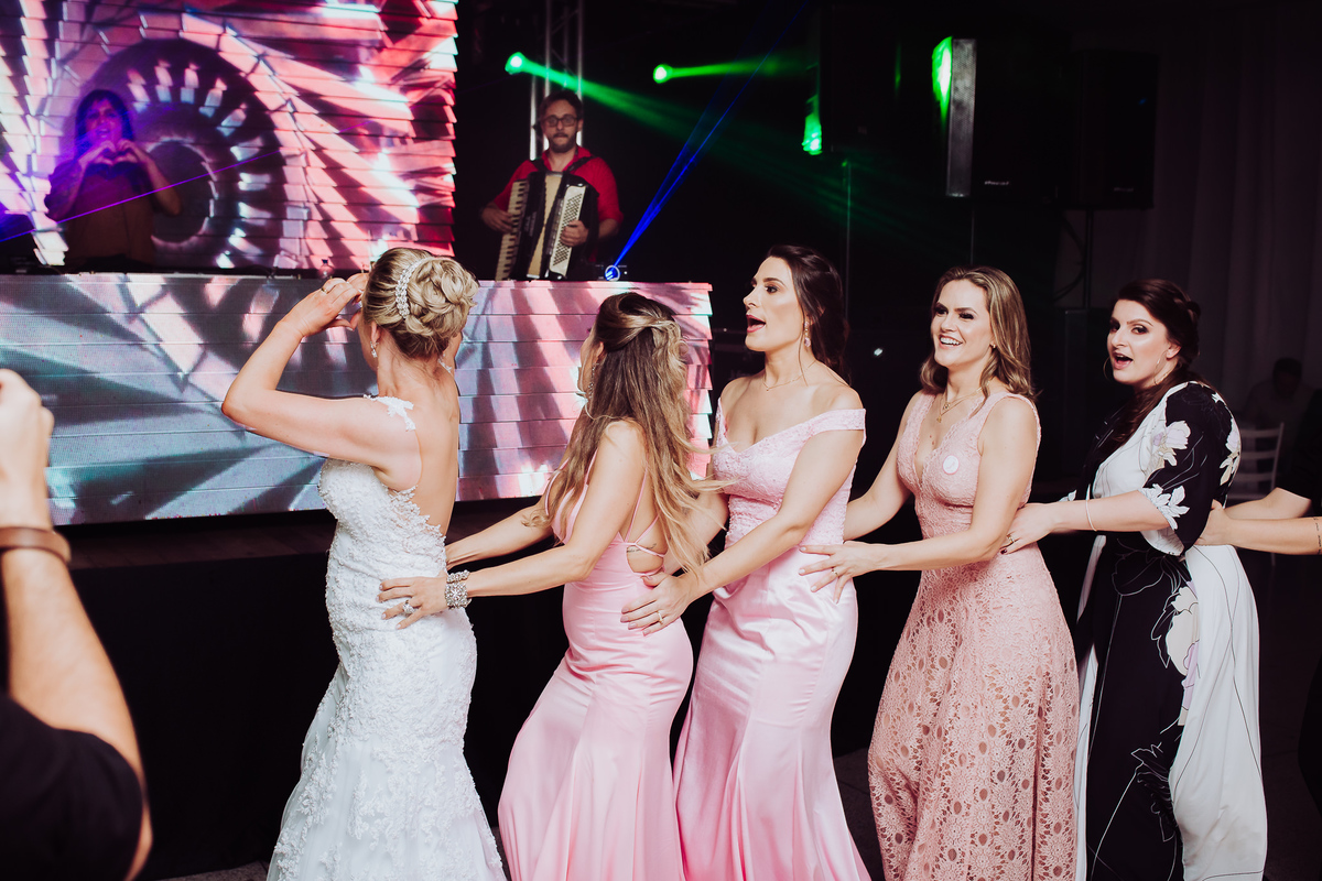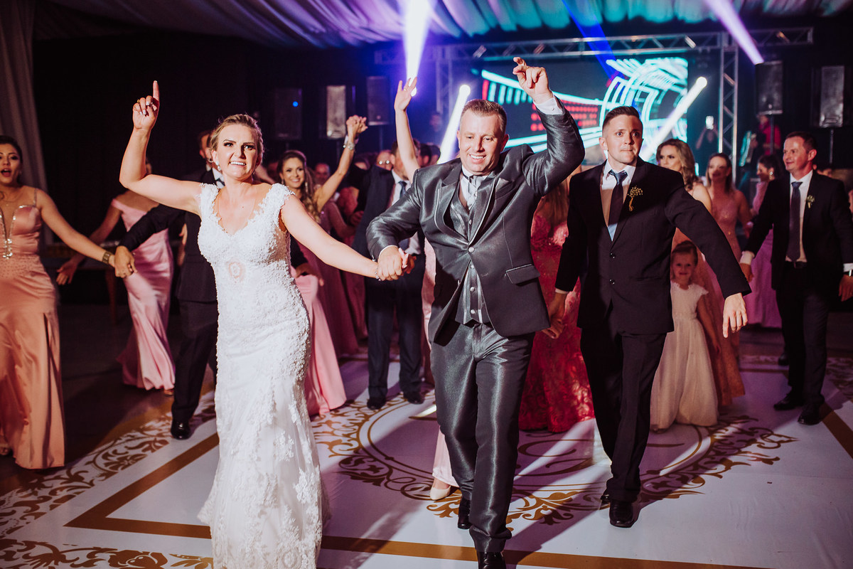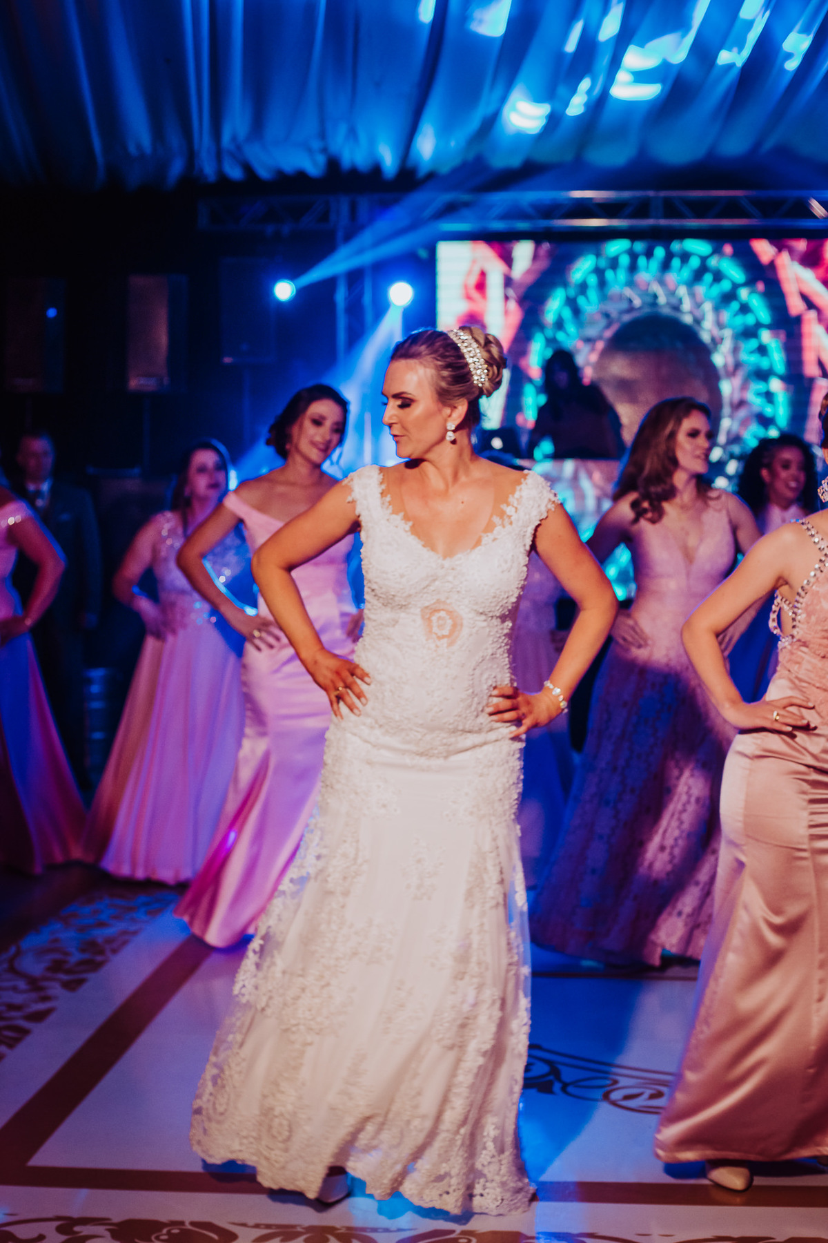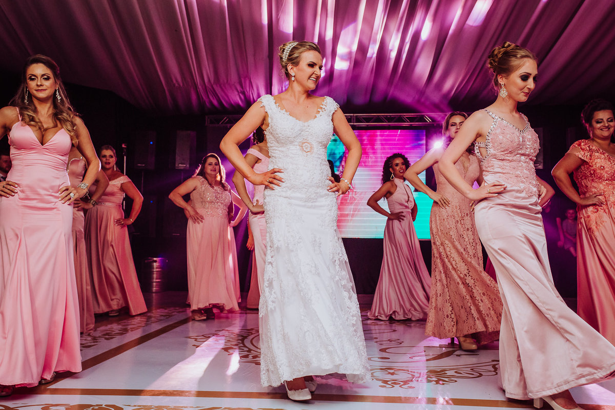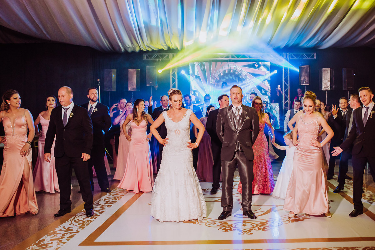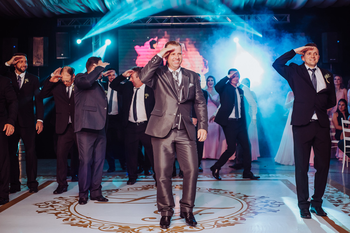 Os padrinhos fizeram, junto com os noivos, coreografias muito bem ensaiadas e já deixaram todo mundo doido para ir para a pista.