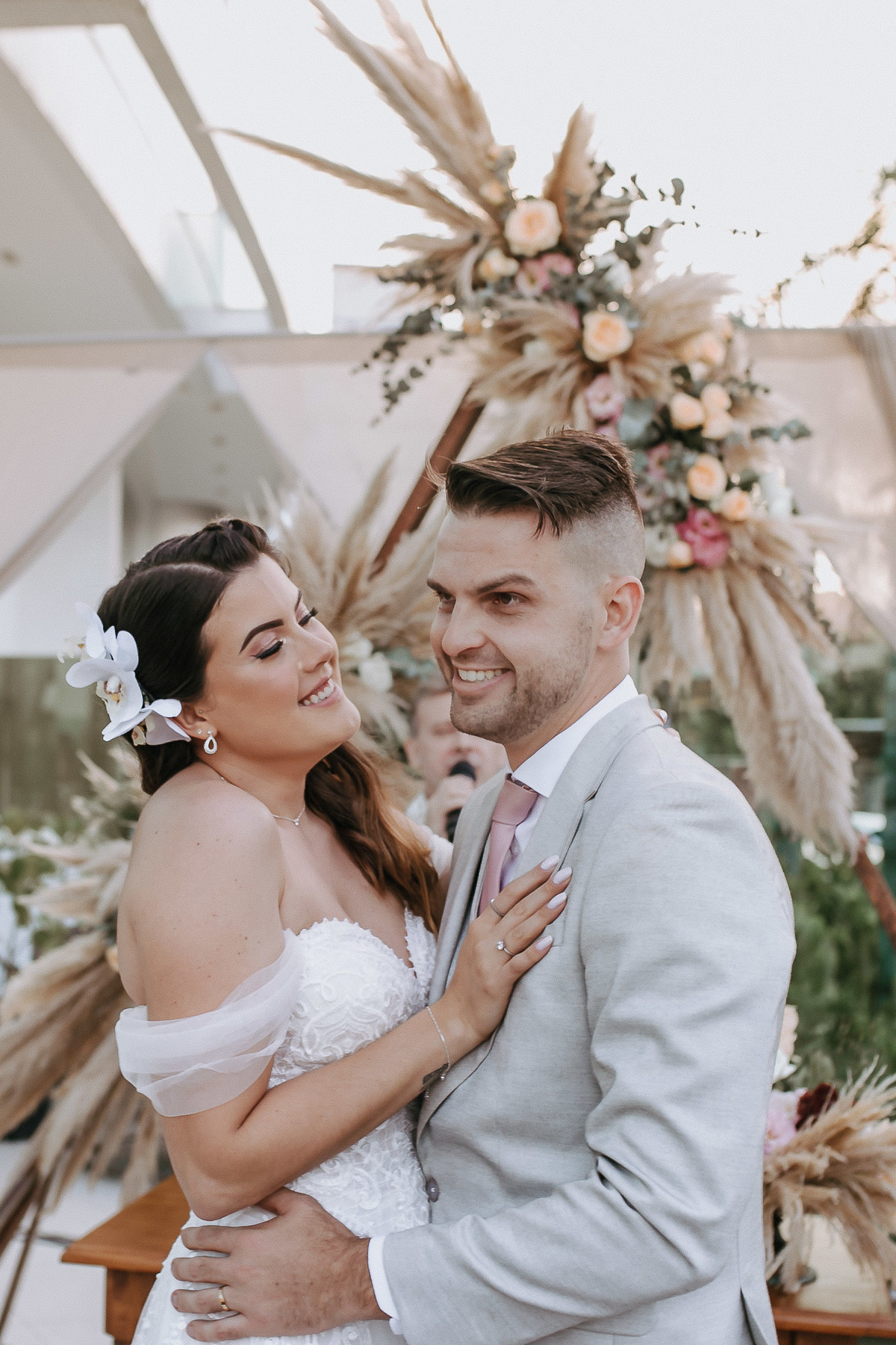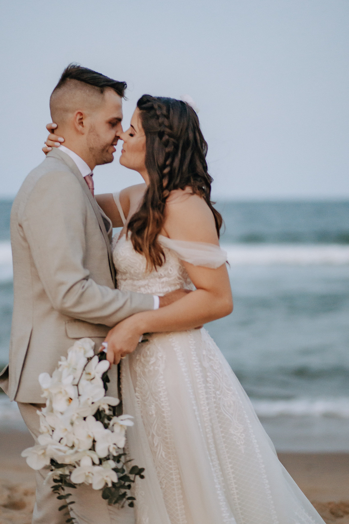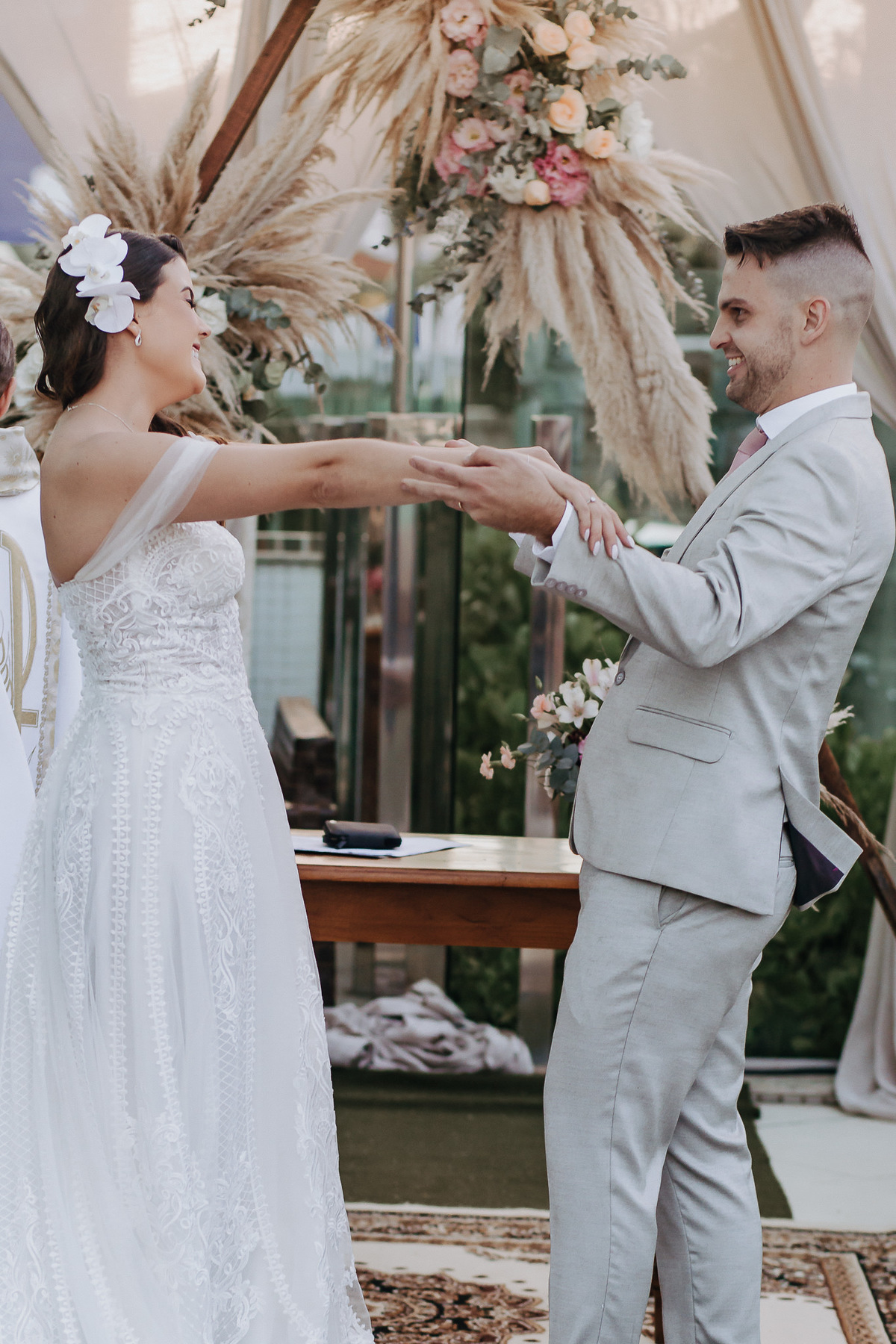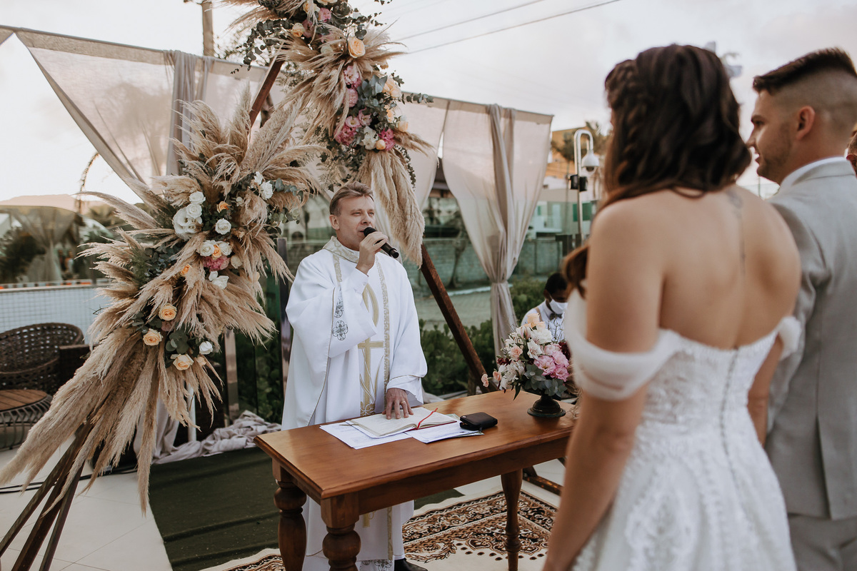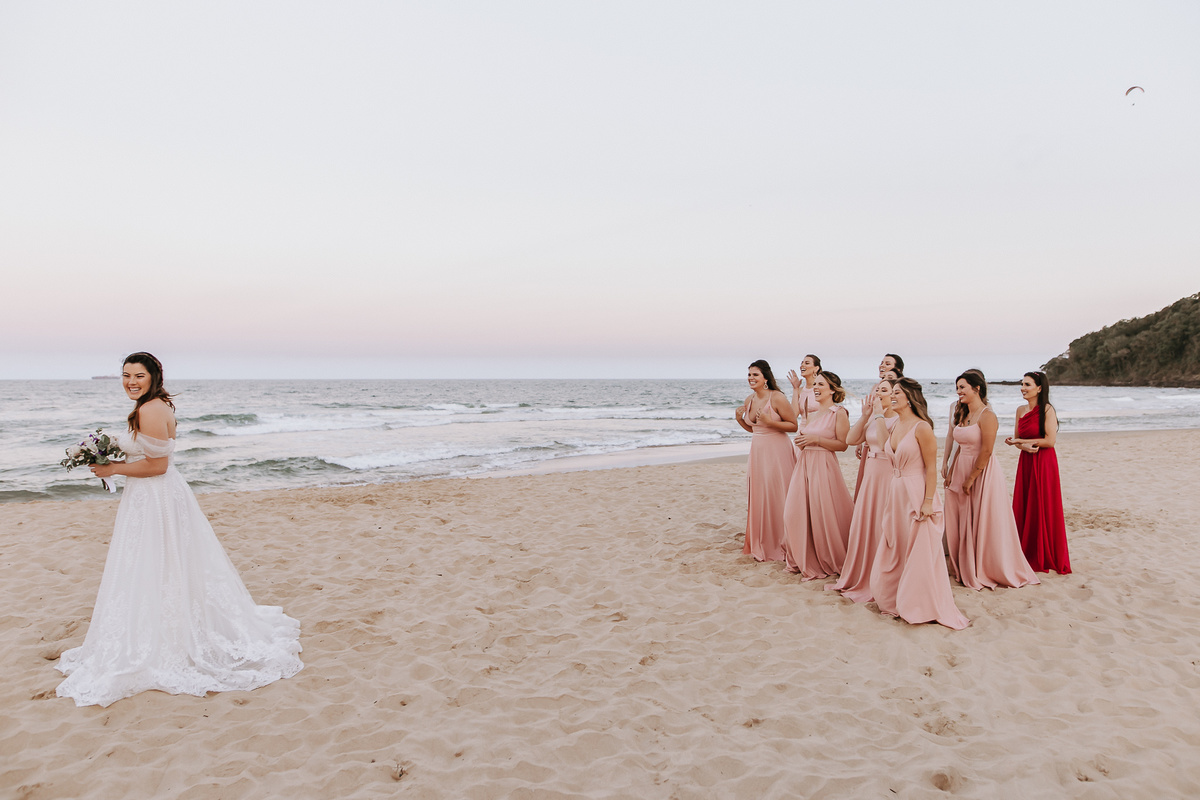 Um casamento de dia, à beira-mar da Praia Brava, na luz do pôr do sol...