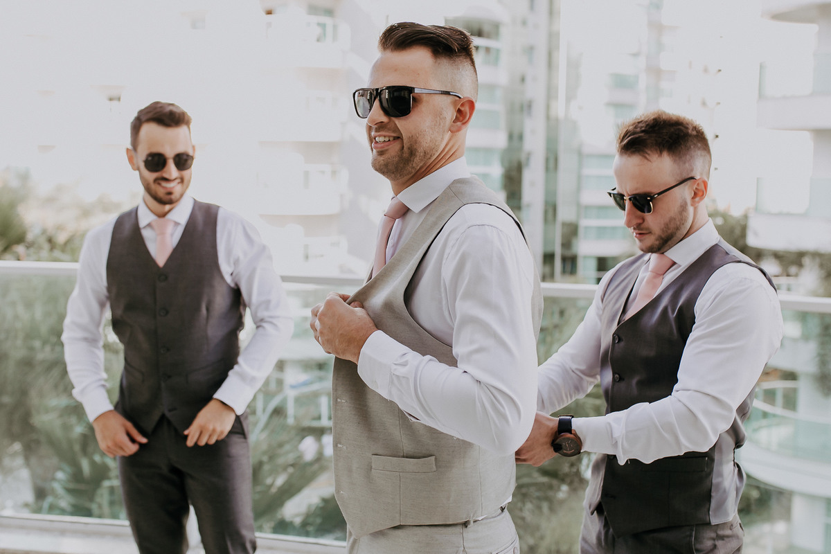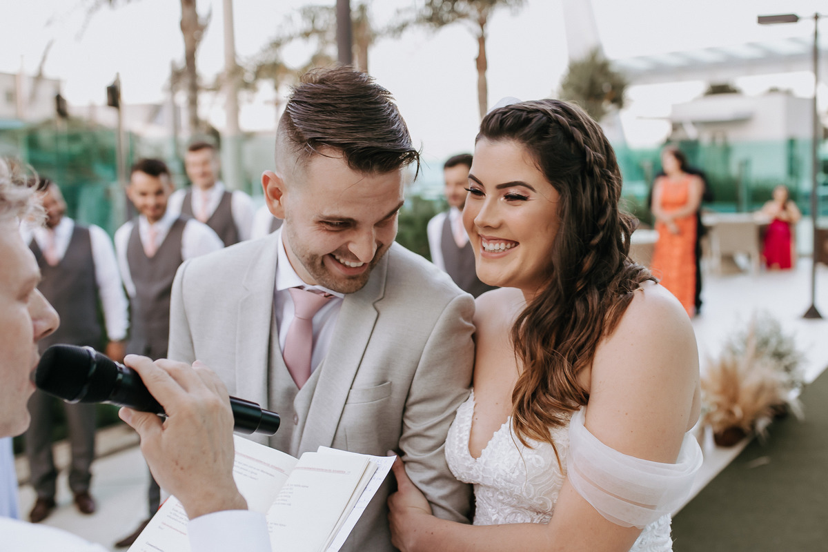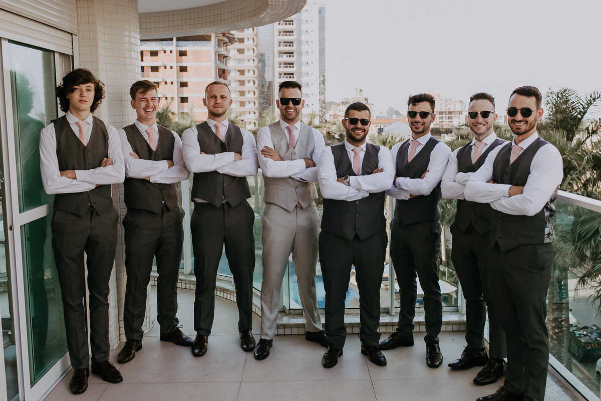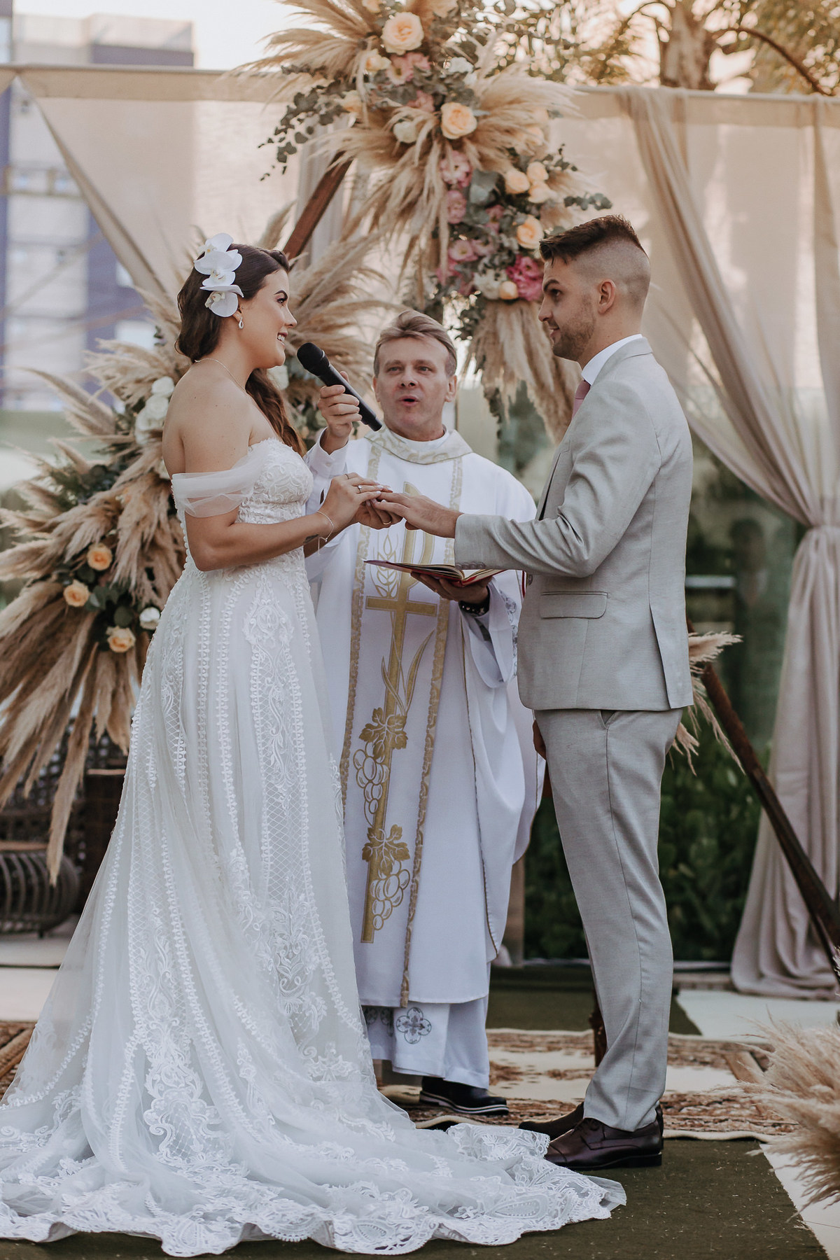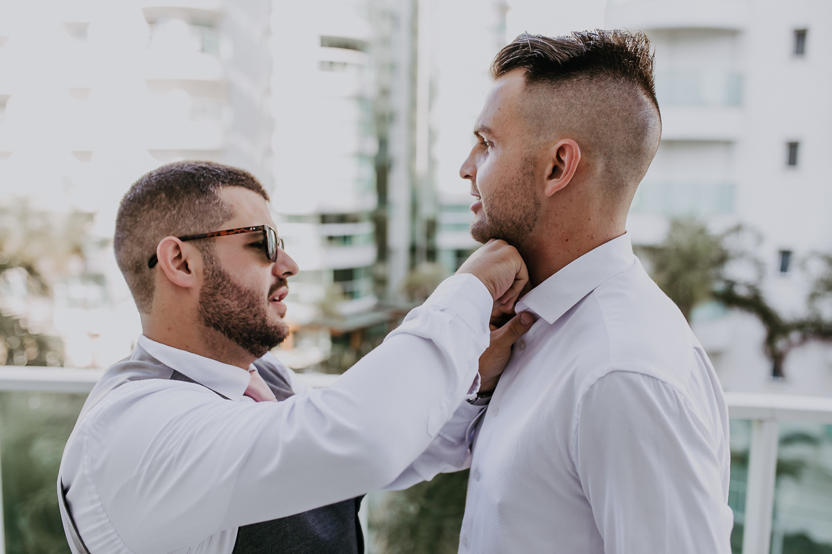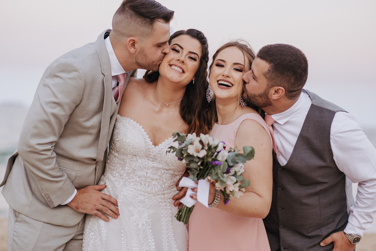 Um casamento de dia, à beira-mar da Praia Brava, na luz do pôr do sol...