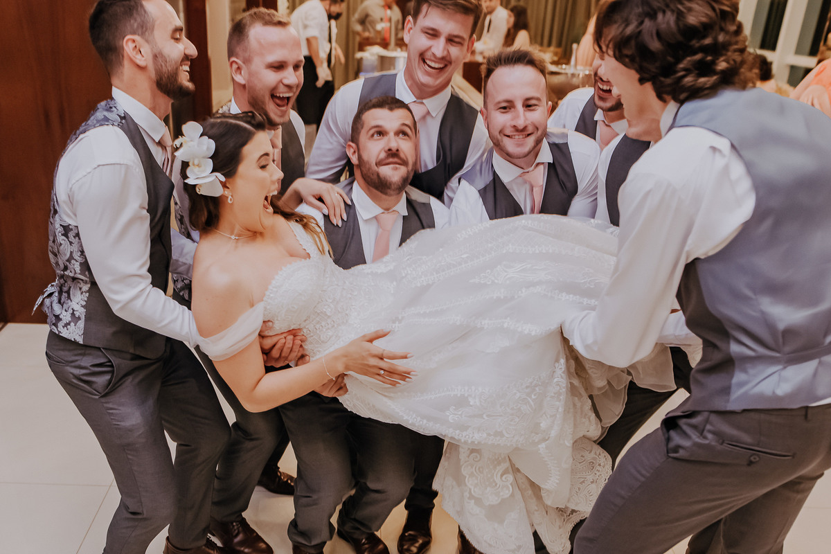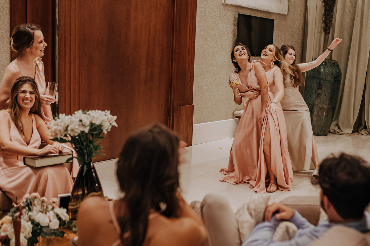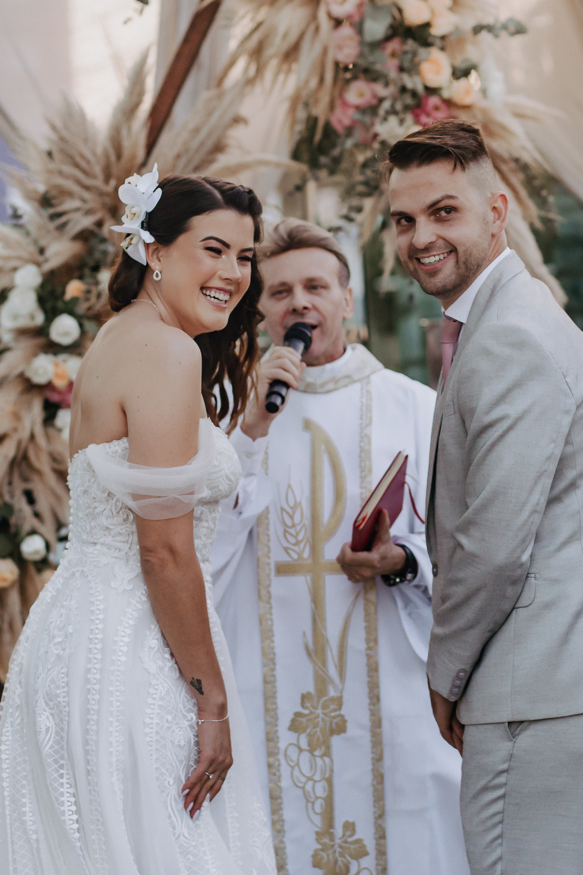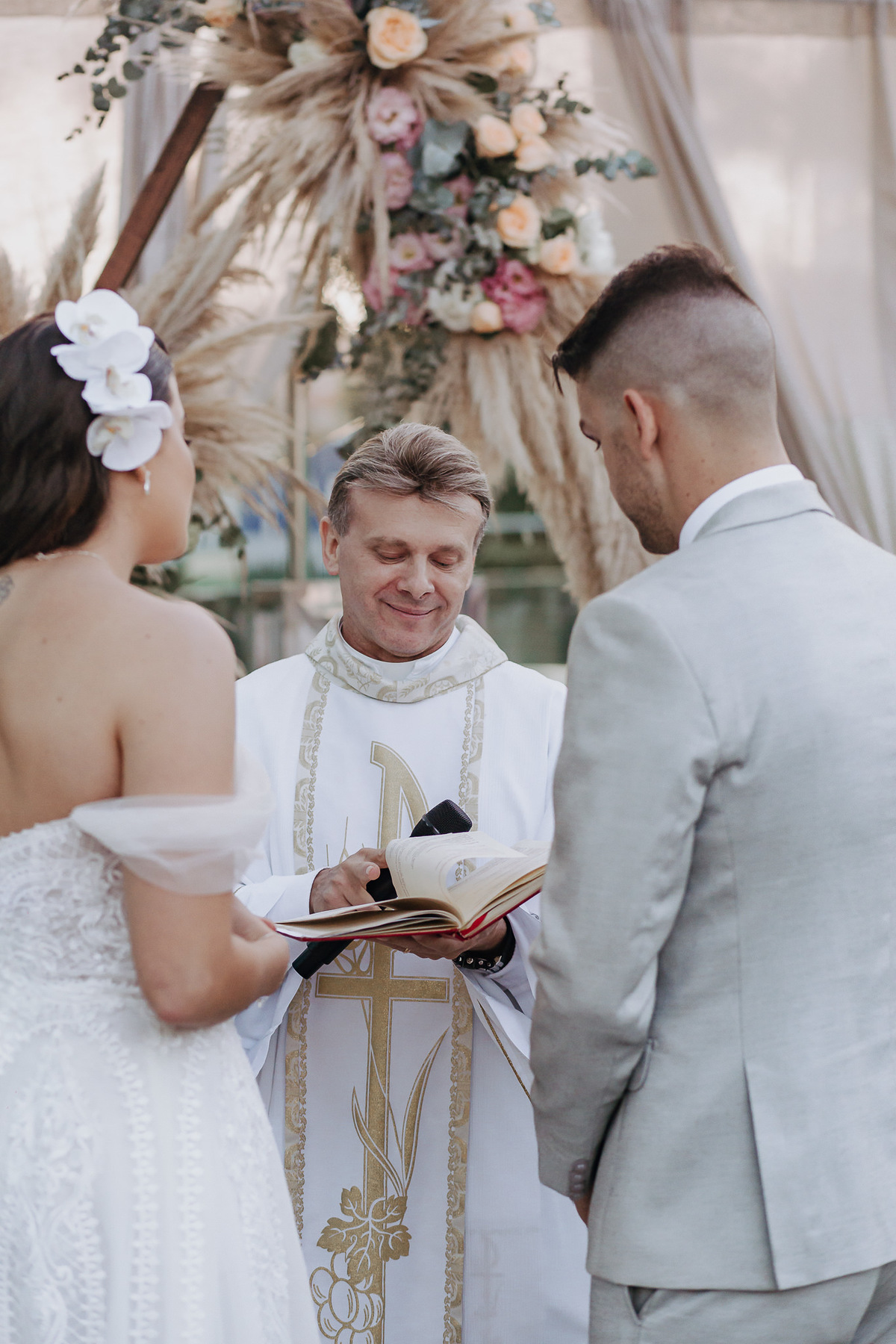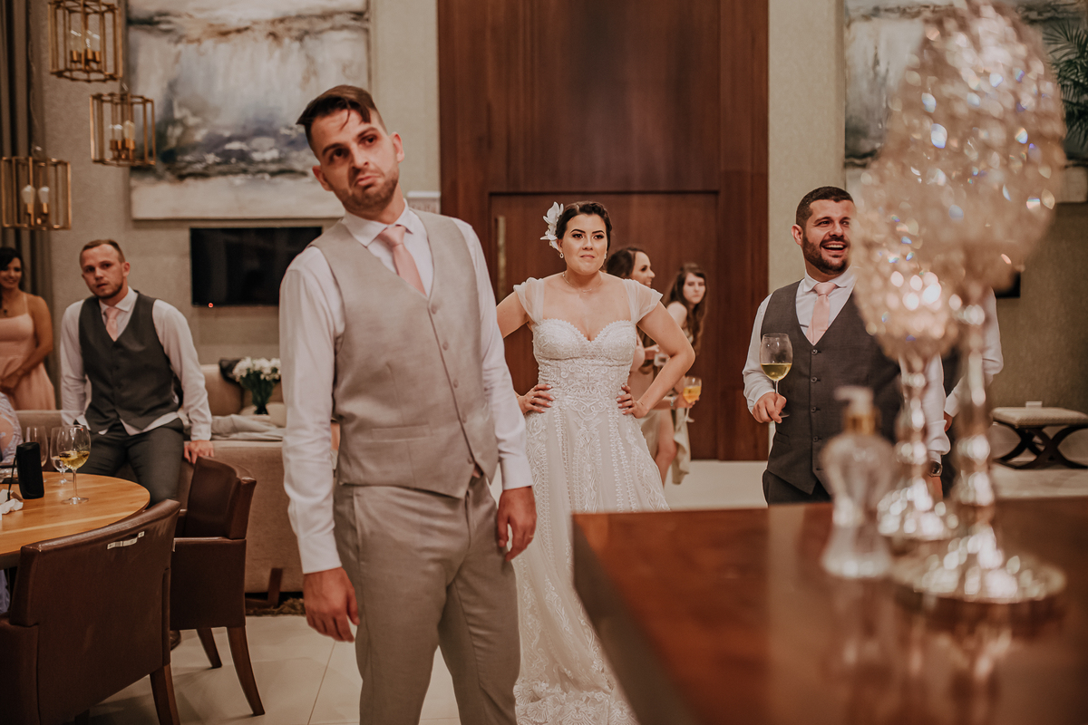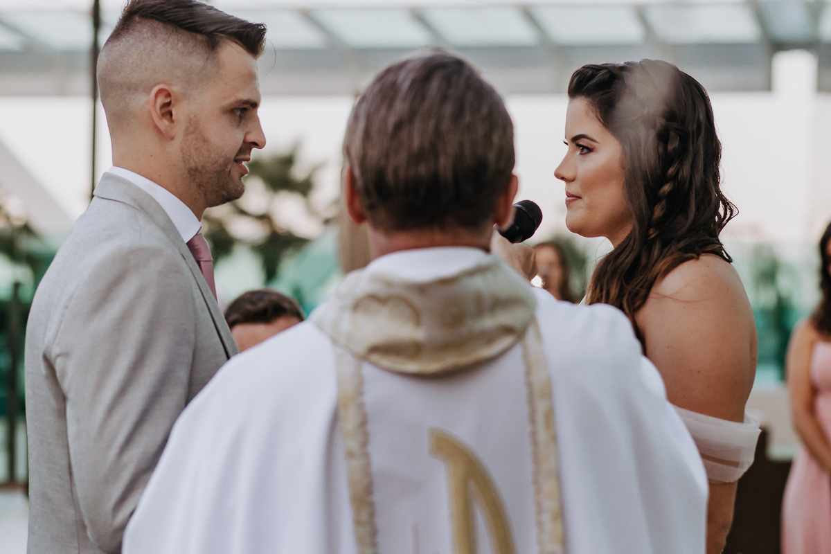 A cerimônia foi emocionante e divertida, o padre Ivam conseguiu envolver todos os convidados e fez todos rirem e chorarem em poucos minutos. Na sequência atravessamos a rua e fomos à praia para fazer algumas fotos e para a Jé jogar o buquê, e logo em seguida começou a recepção cheia de energia. Não canso de dizer... Que animação!
